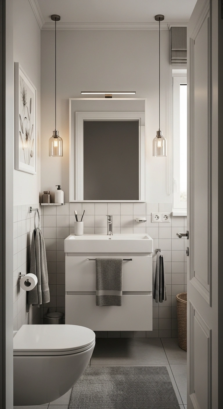 You can also bring in ideas inspired by 26 White Kitchen Ideas by layering different shades of white. Combine warm white walls with cooler white tiles and soft ivory towels. This creates depth without adding clutter.Use natural light whenever possible. If your bathroom lacks windows, install warm LED lighting to keep the space bright. A soft, balanced palette makes everything feel bigger and more peaceful.
