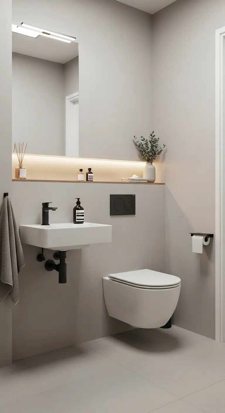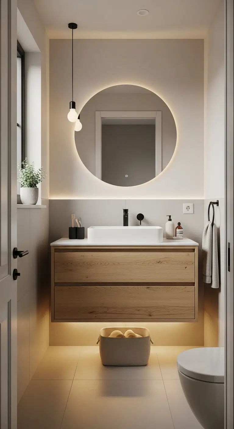 Use soft lighting under the vanity for a subtle glow. This adds depth and makes the room feel warm at night. Pair it with a round mirror to soften the overall design.This is one of the most effective small bathroom ideas that save space and look stylish because it combines function with a sleek visual effect.