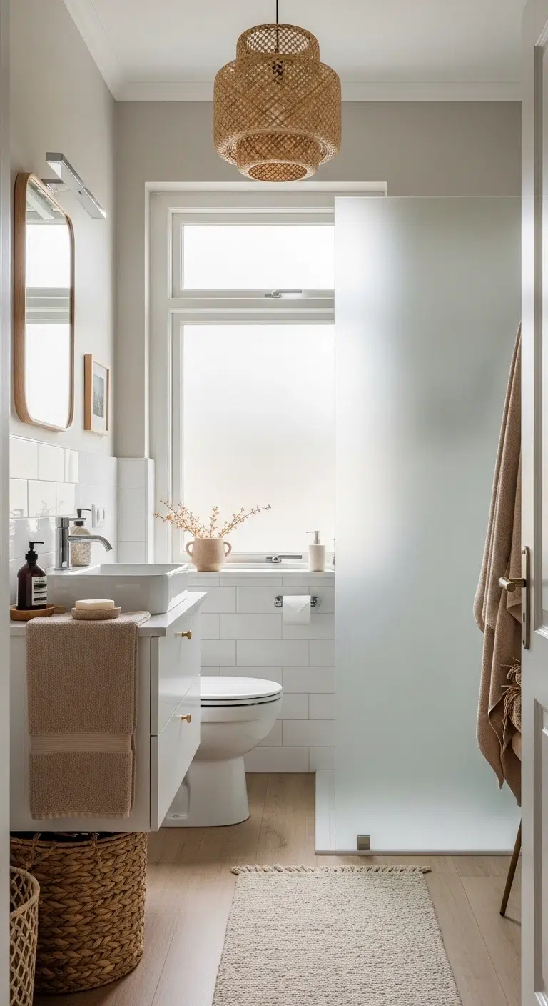 Choose light wood or painted white finishes to keep the look soft. Frosted glass panels also work well because they allow light to pass through while keeping privacy.Sliding shower doors can also replace bulky curtains or hinged doors. This creates a cleaner and more organized layout.This idea improves both function and style. It helps your bathroom feel open while adding a modern design touch.
