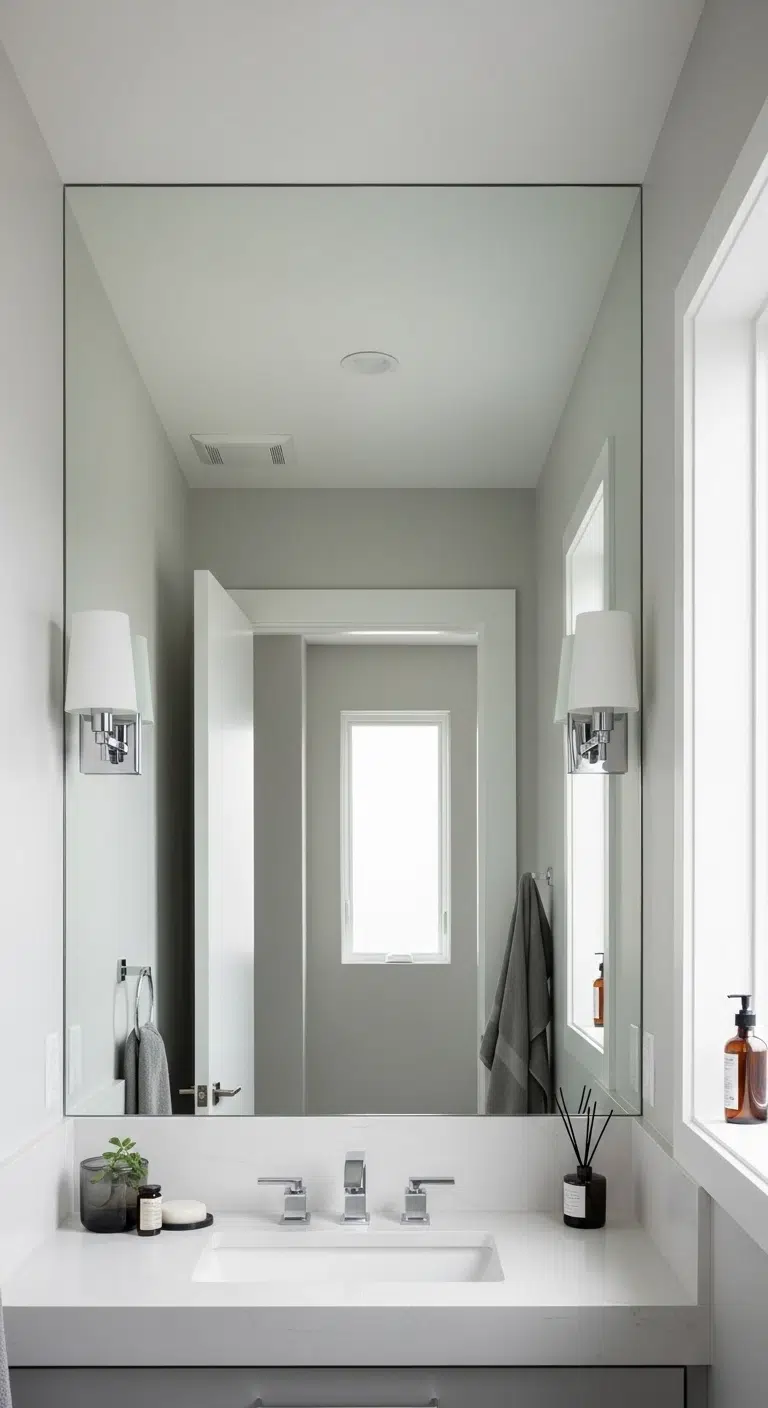 A large mirror can completely change how your bathroom feels. It reflects light and creates the illusion of depth, making the room appear twice as big.Choose a mirror that stretches across the vanity or even the entire wall. Frameless designs work best for a clean and modern look. If you want a bit of style, use a thin black or brass frame.