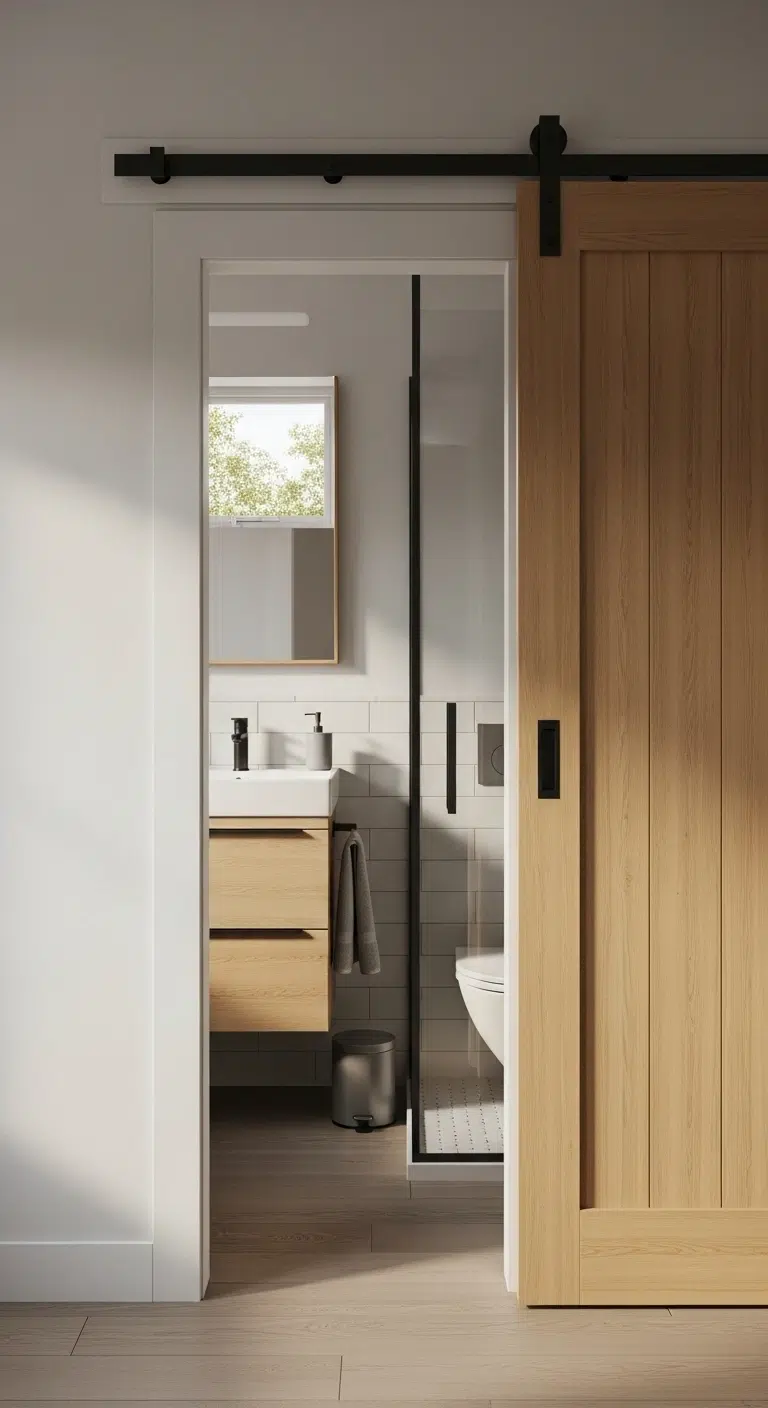 Traditional doors take up space when they open. Sliding doors solve this problem by saving both space and movement area.Pocket doors are a great option if you are renovating. They slide into the wall and disappear completely. If that is not possible, use a barn-style sliding door mounted on the outside.