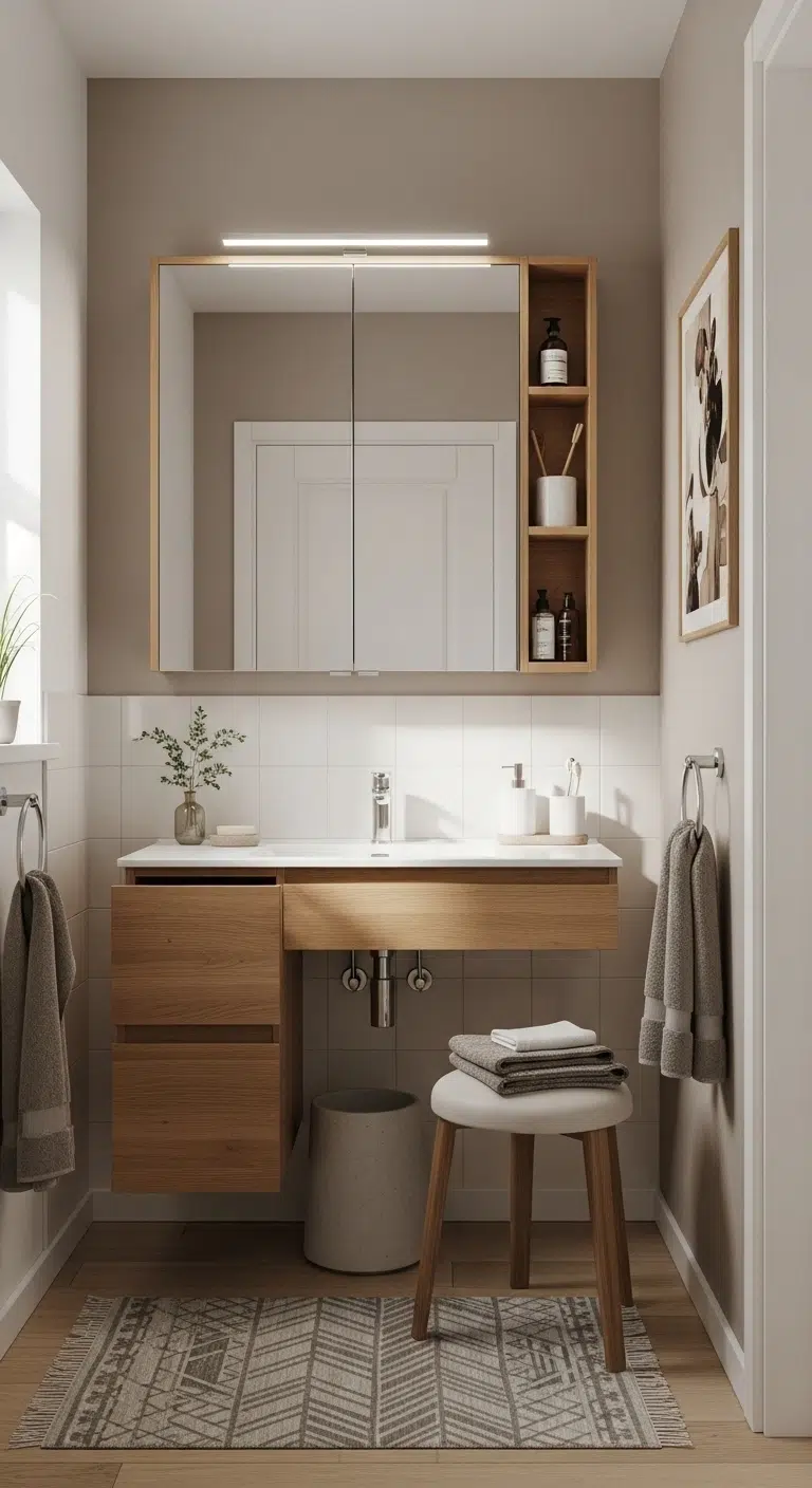 In a small bathroom, every piece should serve more than one purpose. Multi-functional furniture helps you save space while staying organized.Choose a vanity with built-in drawers or hidden compartments. This keeps your essentials tucked away. A mirror cabinet can also provide storage without taking extra space.