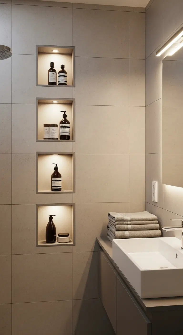 Use tiles inside the recessed areas that match or slightly contrast with your walls. This adds a subtle design detail while keeping the look cohesive.Lighting inside recessed shelves can create a soft glow. This adds depth and a warm touch to your bathroom.This idea works well for modern and minimal designs where clean lines matter most.