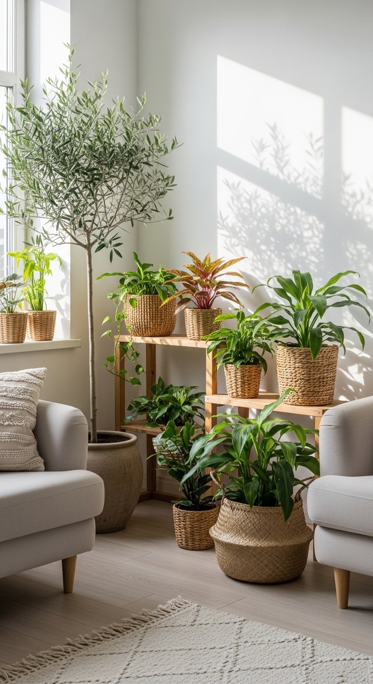 To style plants effectively, avoid overcrowding them. Let each plant have space to stand out. Use plant stands in light wood or black metal. Keep pot designs simple and minimal. Make sure natural light supports plant growth. This small addition makes your living room feel more connected to nature.