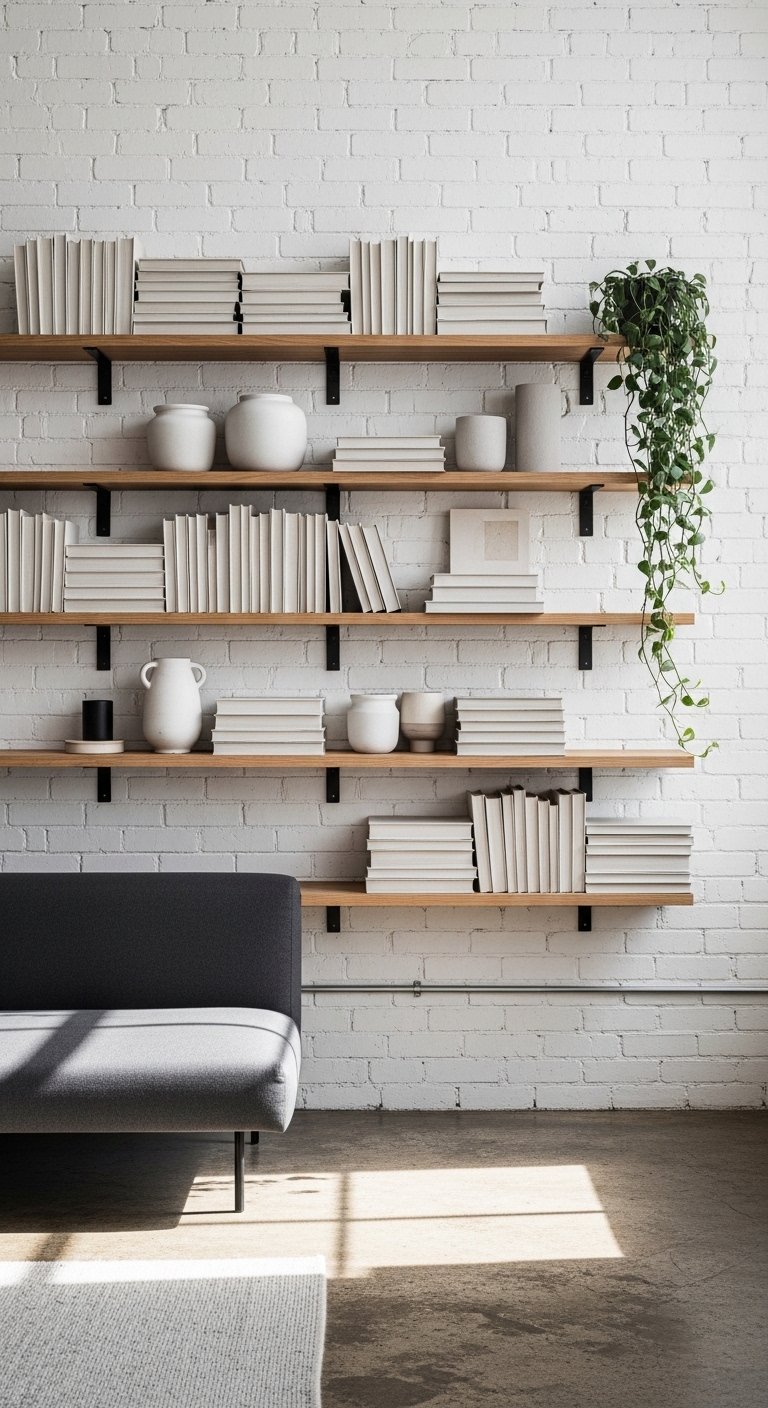To recreate this, limit décor items to meaningful or useful pieces only. Group objects in threes to create balance without clutter. Add one trailing plant for softness and movement. Avoid mixing too many materials or bright colors. Keep the bottom shelves practical and the top shelves decorative. This makes your shelving both functional and beautiful.