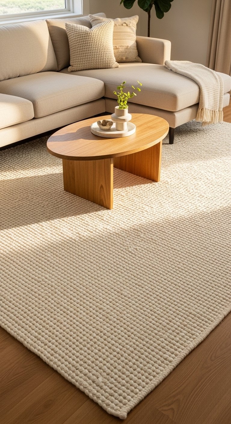 A large neutral rug helps ground your Scandinavian living room design. Choose wool, jute, or flat-weave cotton in ivory, oatmeal, or light gray. The rug should extend under the front legs of your sofa and chairs. This creates a connected and cozy seating area. Subtle patterns like thin stripes or soft geometric lines add quiet interest. The texture adds warmth against wooden floors. The space instantly feels more complete.