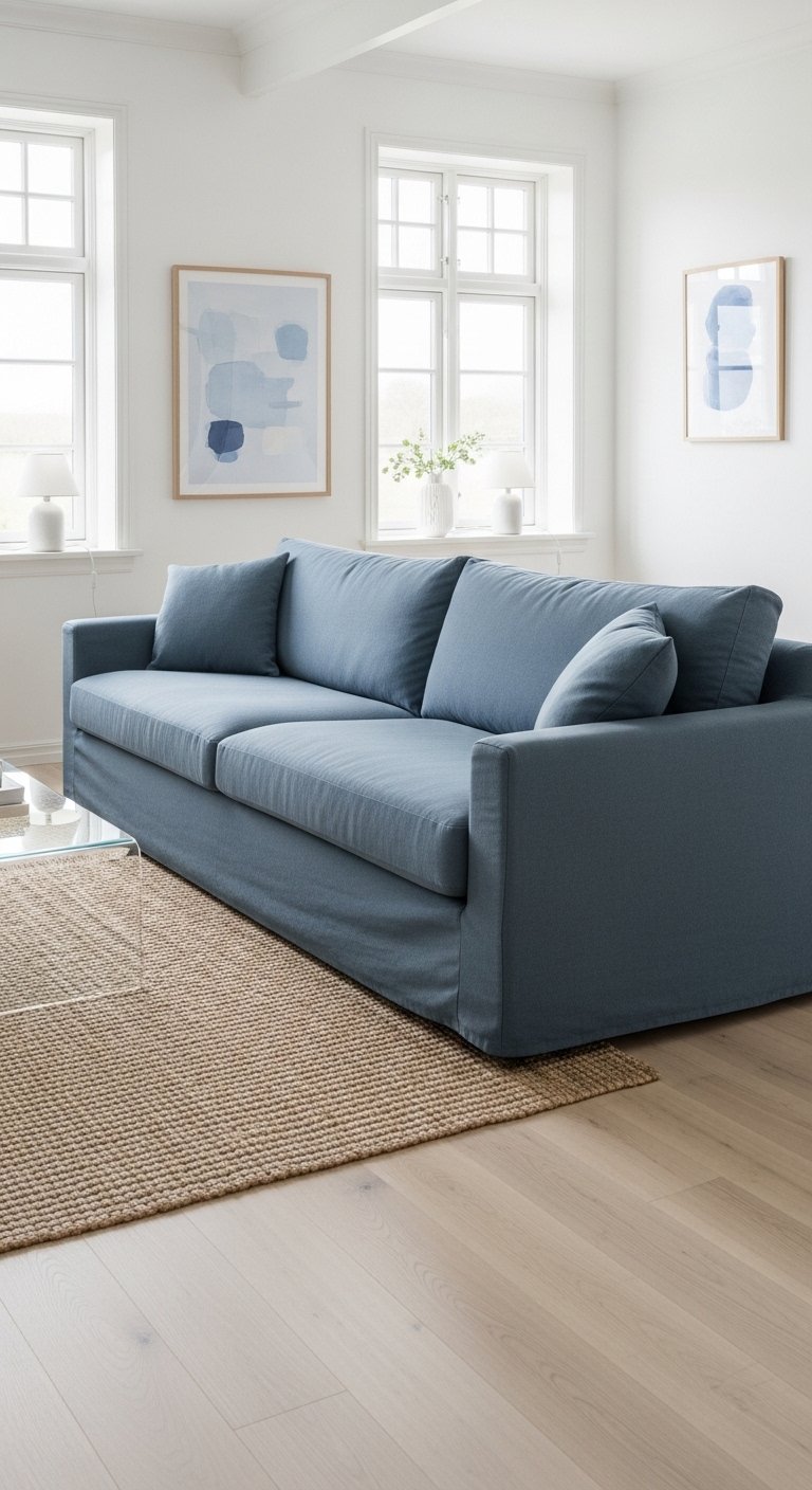 A muted blue sofa introduces soft color while keeping the room serene. Choose dusty blue or gray-blue tones instead of bright navy. Pair it with cream walls and pale wood furniture. Add beige and off-white cushions to soften the look. The blue acts as a quiet statement without dominating the space. Natural light enhances its cool yet cozy feel. The room stays calm and balanced.