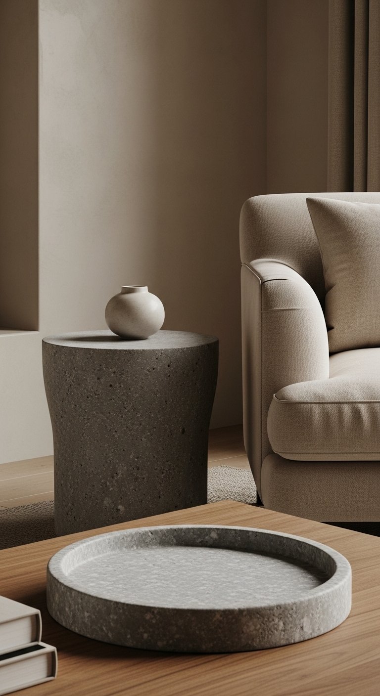 Natural stone or concrete elements bring depth to a Scandinavian interior. Consider a small concrete side table or stone tray on your coffee table. Pair it with soft fabrics to balance hardness. The contrast feels modern and grounded. Keep the tones light gray or beige to maintain harmony. The texture adds interest without overpowering the design.
