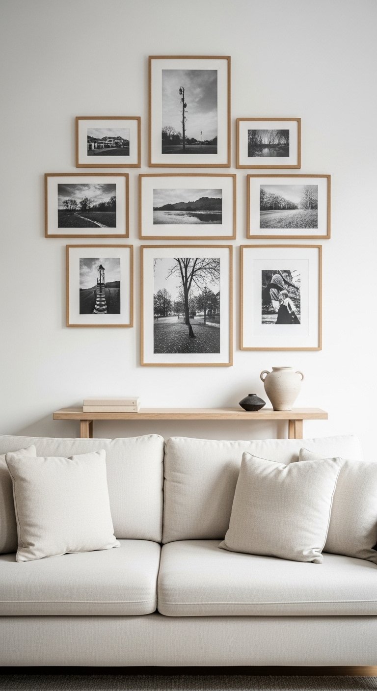 A neutral gallery wall enhances your Scandinavian living room décor without overwhelming it. Choose black-and-white photography or soft abstract prints. Use thin wooden or black frames for consistency. Arrange them in a clean grid or gentle asymmetrical layout. Leave equal spacing between frames for breathing room. The display feels intentional and modern.
