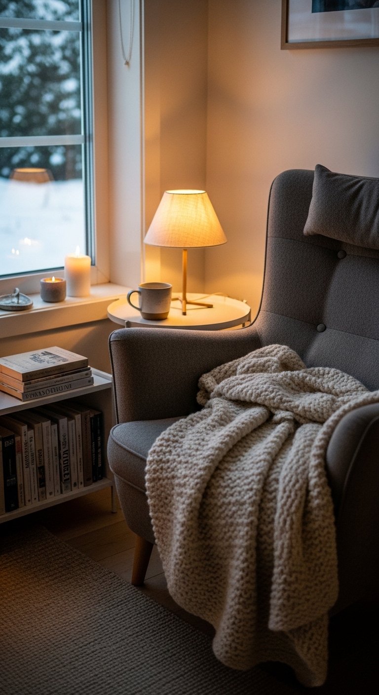 A hygge-inspired corner brings comfort to your living room. Place a soft armchair near a window with a small wooden side table. Add a chunky knit throw and a floor lamp with warm light. Include a small bookshelf or stacked magazines nearby. Keep the colors neutral and calming. The goal is to create a space that feels peaceful and inviting.