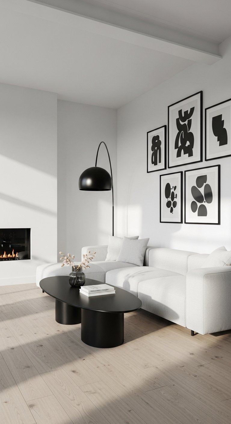 A black and white Scandinavian living room feels crisp and modern. Start with white walls and a light sofa. Add black metal accents in lighting or table legs. Use graphic black frames for artwork. Keep the contrast sharp but balanced with soft textiles. The room feels clean yet visually interesting.