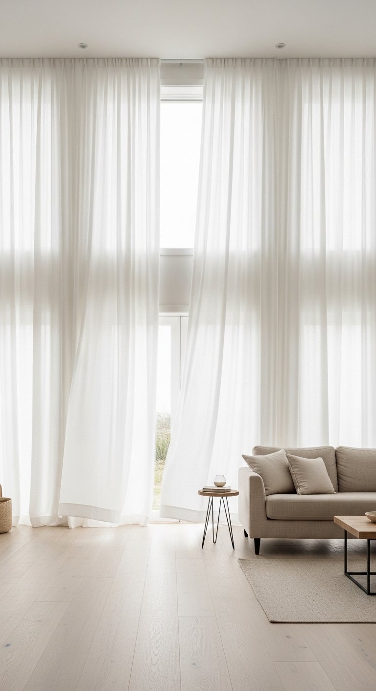 Scandinavian homes celebrate natural light. Install floor-to-ceiling sheer curtains in white or soft beige. Let them gently filter sunlight during the day. The fabric should move lightly with air flow. This creates a dreamy and peaceful atmosphere. It also makes ceilings appear higher.
