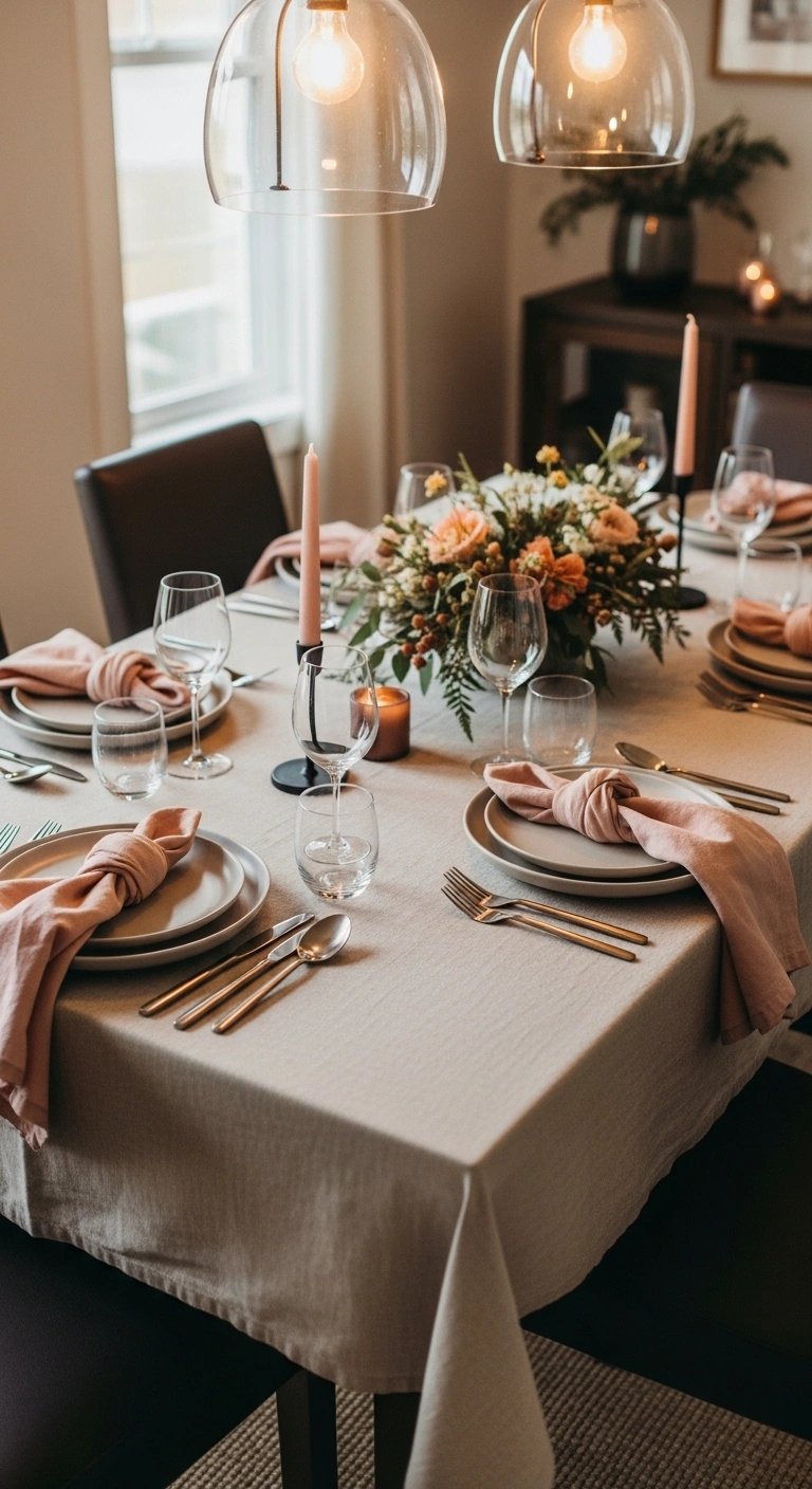 A simple dining table feels more romantic than an overfilled one. Neutral table linens create a clean base. Soft pink napkins add gentle color. Minimal centerpieces keep the table open. Warm lighting makes meals feel special. The focus stays on food and conversation. The table looks elegant and inviting.