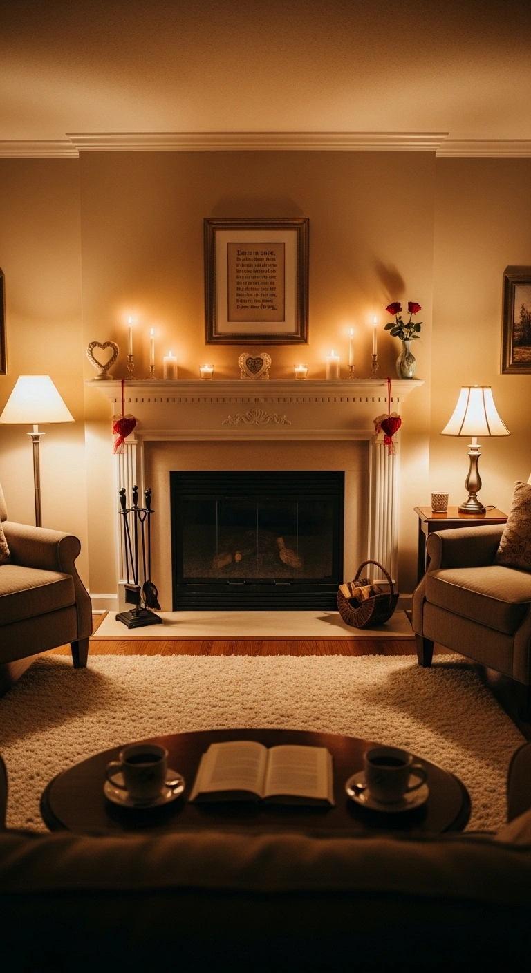 Fireplaces feel naturally romantic. Warm light draws attention. Soft décor enhances comfort. Neutral styling keeps balance. The space feels inviting. Romance feels classic. The mood feels timeless