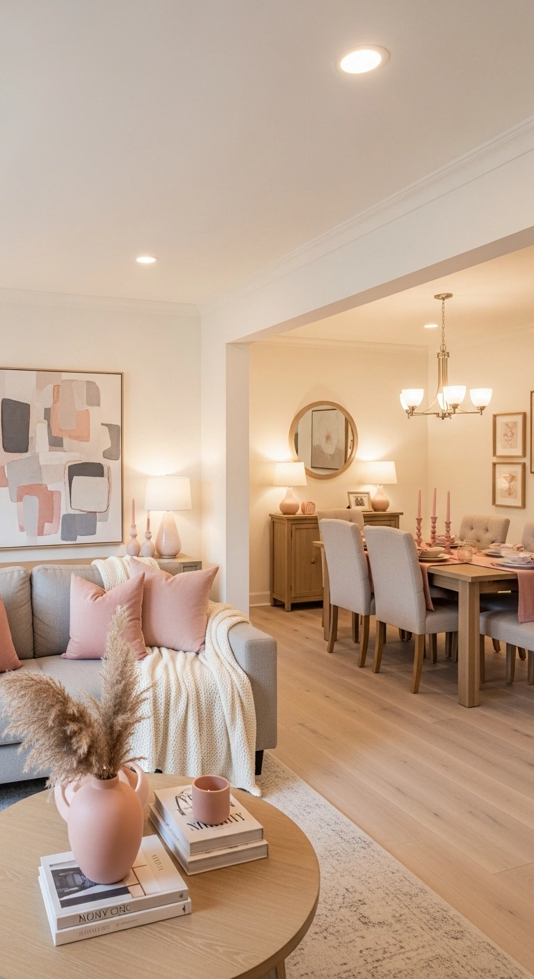 To apply this look, keep your main furniture neutral and add blush accents slowly. Change cushion covers instead of buying new pillows. Layer one or two throws for texture without clutter. Use warm bulbs in lamps to enhance the cozy mood. Keep décor items minimal and spaced out. Repeat the same colors in small details. This setup stays budget-friendly and easy to refresh.