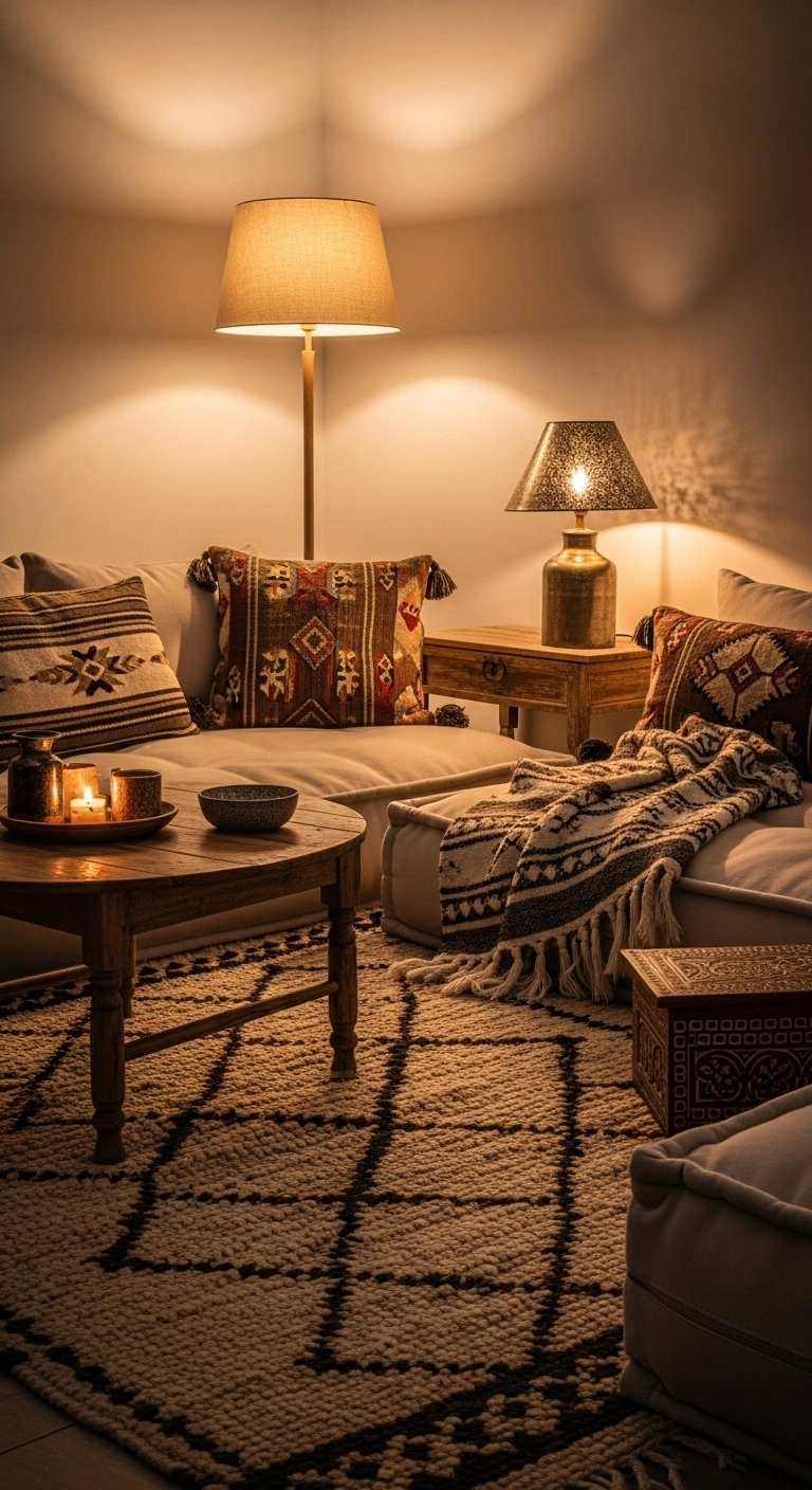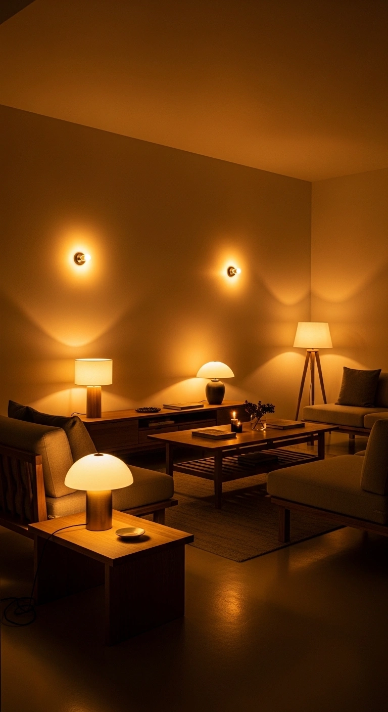 Use lamps instead of ceiling lights. Choose bulbs with warm tones. Add dimmers if possible. Spread light sources across the room. Avoid bright white lights. Pair lighting with neutral décor. This setup changes the mood instantly.