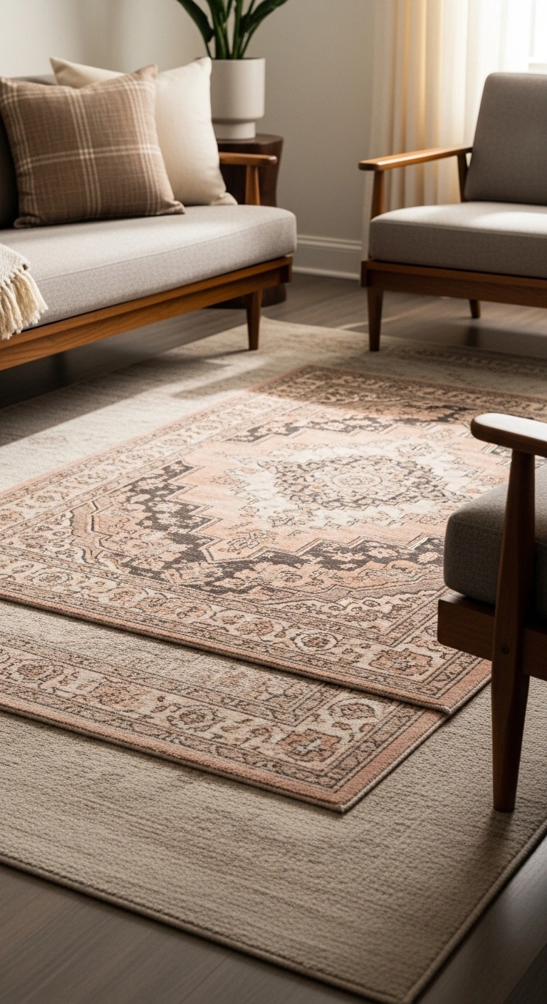 Layered rugs add warmth and texture instantly. Soft fabrics feel comfortable underfoot. Neutral base rugs keep balance. A blush or patterned top rug adds interest. The room feels grounded and cozy. Visual depth increases without clutter. Romance feels subtle and stylish.