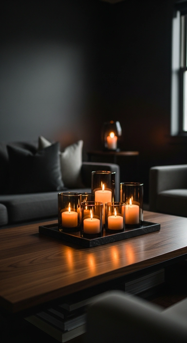 Candle clusters instantly create a romantic mood in any living room. Different candle heights add depth and visual interest. Soft candlelight brings warmth to the entire space. Glass or ceramic holders reflect light gently. Neutral candle colors keep the look clean and stylish. The coffee table becomes a cozy focal point. Evening gatherings feel more intimate and special.