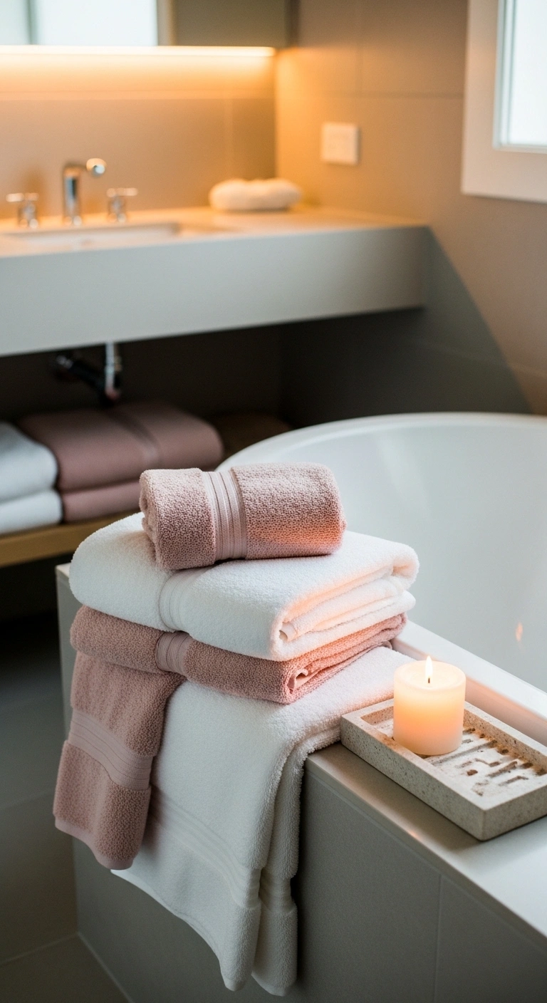 Change towels to blush or white. Add one candle near the sink. Use minimal décor. Keep surfaces clear. Choose warm light bulbs. Add a small plant if possible. This upgrade feels luxurious.