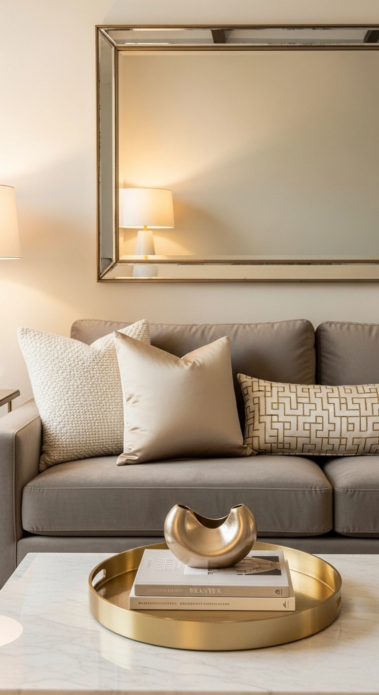 Use metallic frames or trays. Keep metals minimal. Pair with neutral colors. Avoid shiny overload. Match metal tones across the room. Use warm lighting to soften shine. This detail feels luxurious.