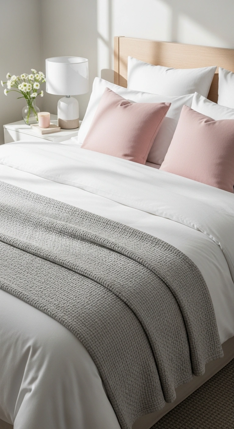 Use neutral sheets with blush accents. Add one textured blanket. Keep patterns minimal. Wash bedding before use. Layer pillows neatly. Avoid overcrowding the bed. This refresh is quick and affordable.