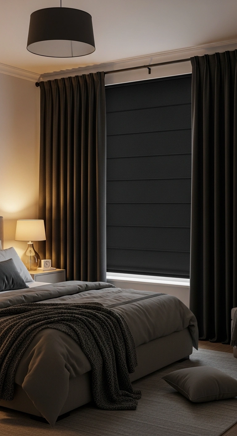 This style works well in modern living rooms or bedrooms where you want a bold but controlled look. Add warm lighting to soften the contrast in the evening.Keep décor minimal so the curtains remain the focal point.