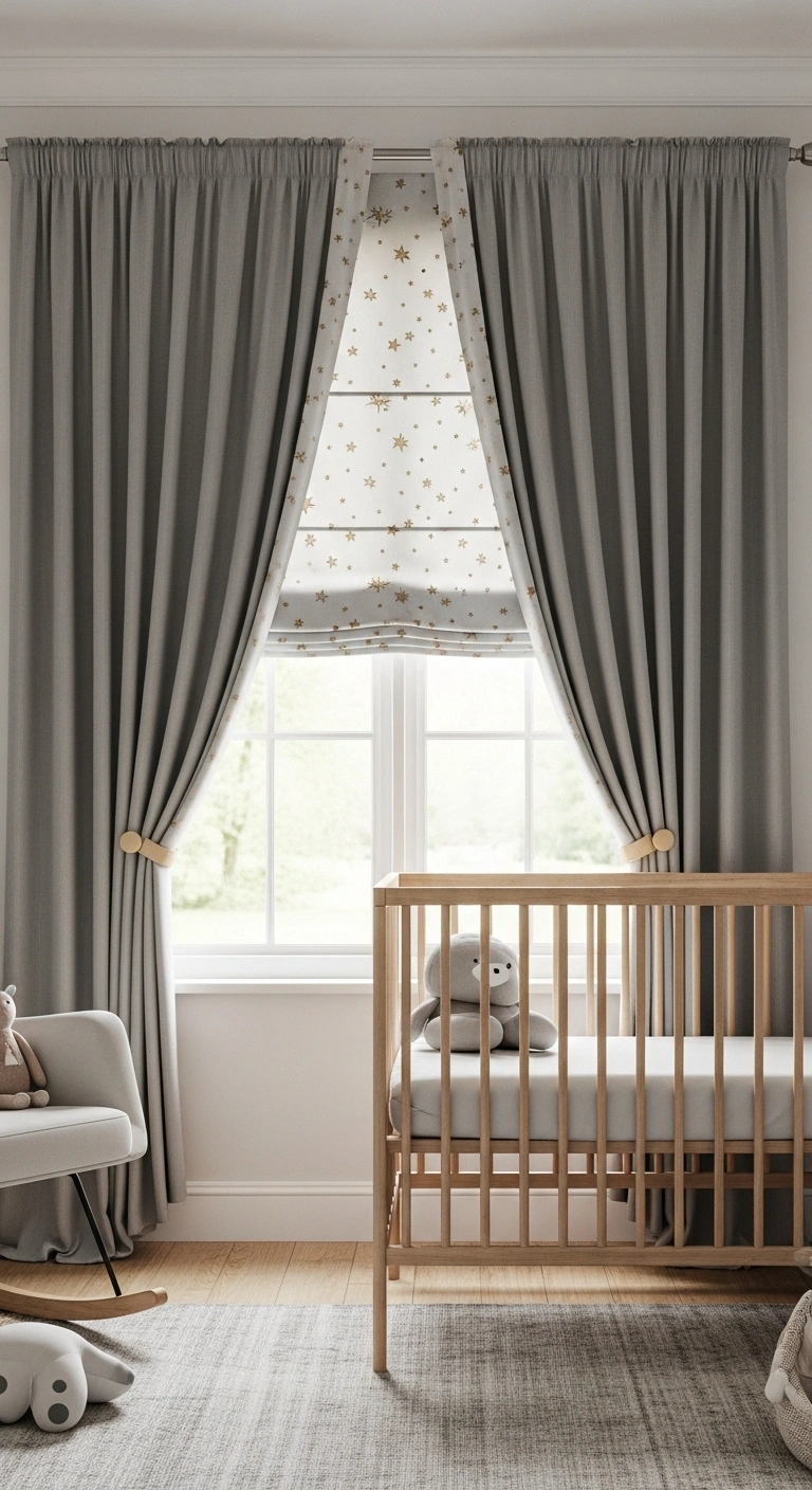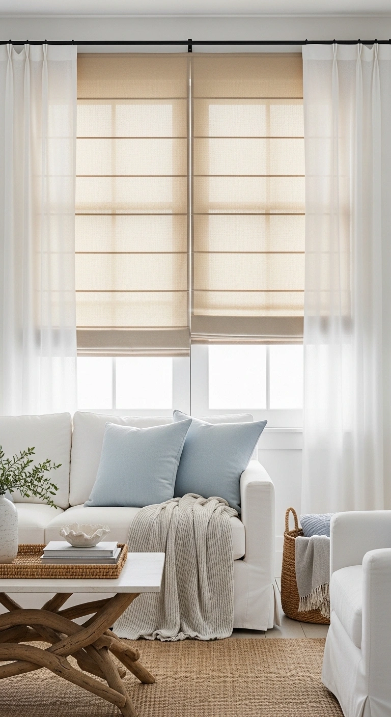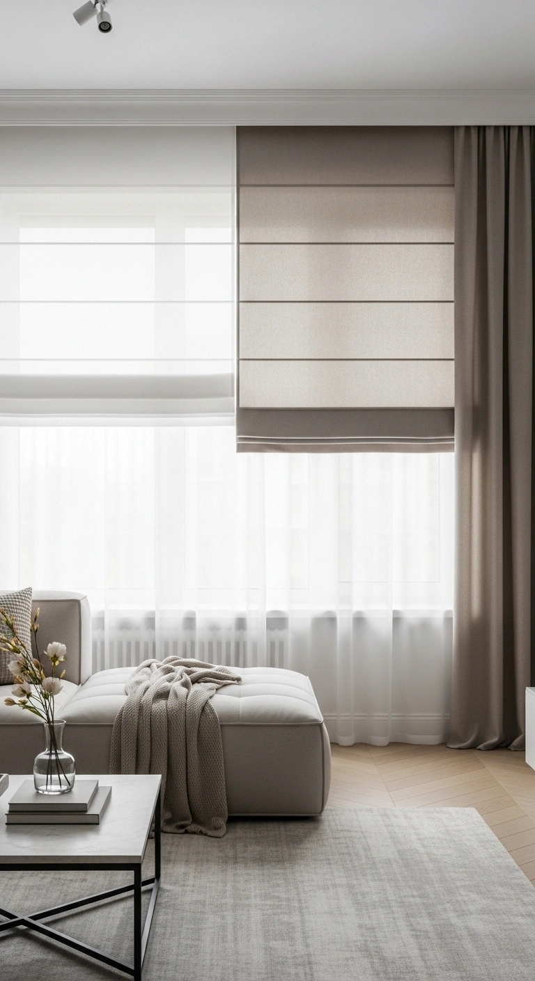 Layering Roman curtains with sheer panels adds both function and style. Start with a neutral Roman shade in cream or taupe, then add sheer white curtains underneath. This combination allows you to control light while creating a soft, layered look.