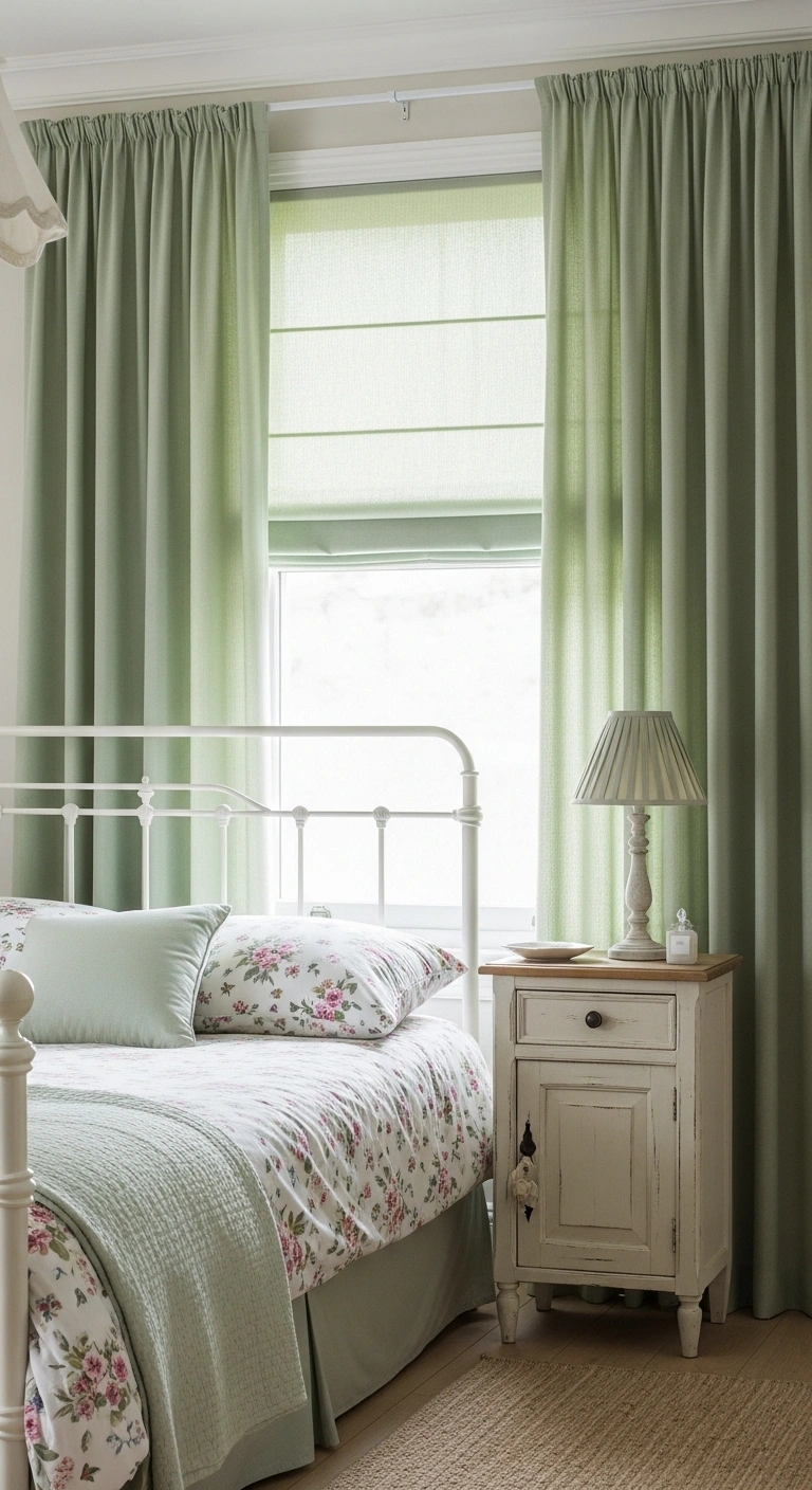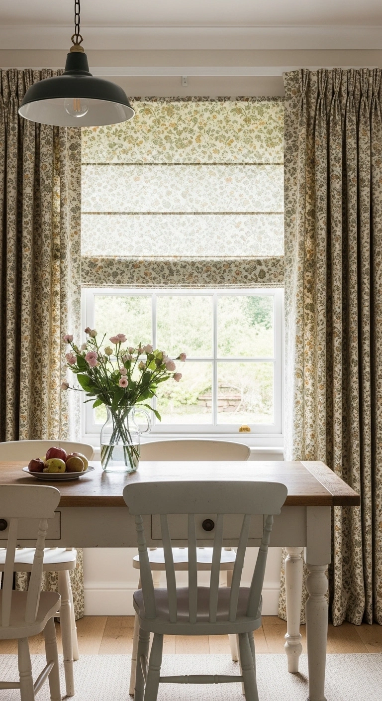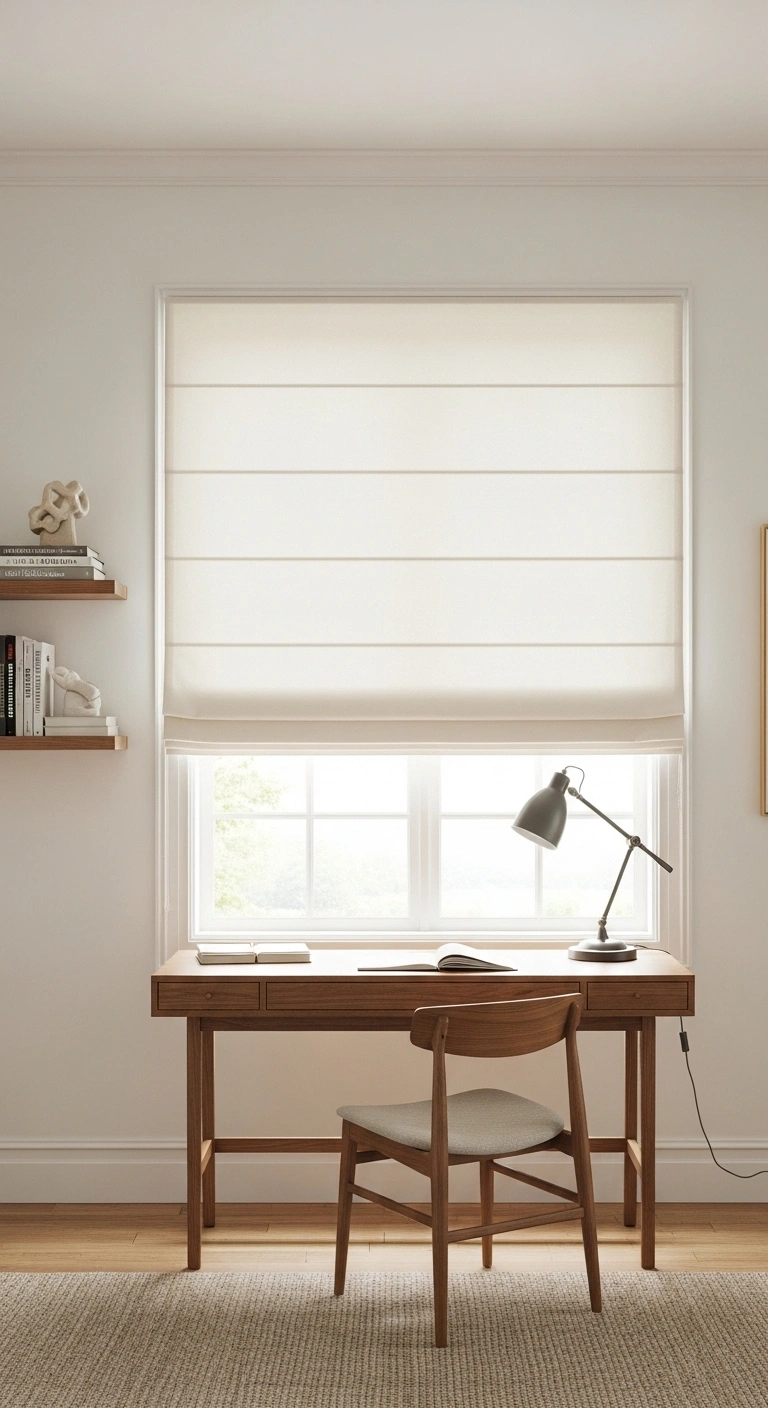 Layering Roman curtains with sheer panels adds both function and style. Start with a neutral Roman shade in cream or taupe, then add sheer white curtains underneath. This combination allows you to control light while creating a soft, layered look.