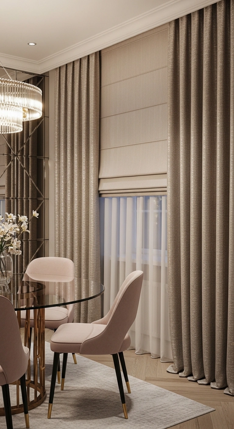 Dual-layer Roman curtains combine two fabrics in one system—usually a sheer layer and a thicker outer layer. This allows you to adjust light and privacy easily.