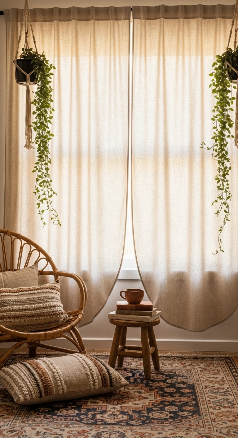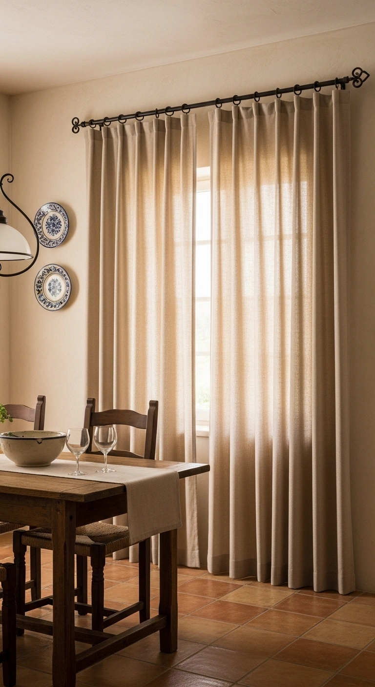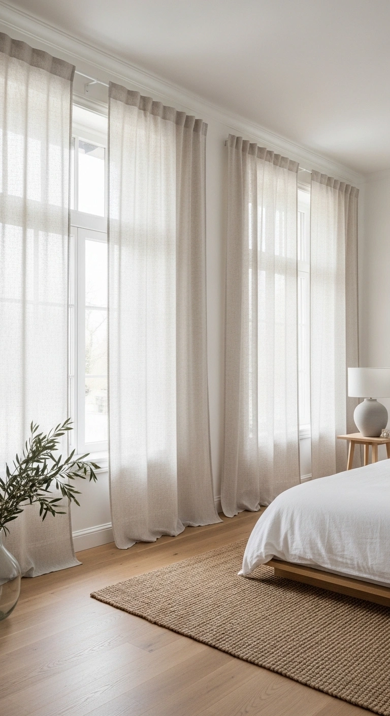 Choose lightweight fabrics like washed linen or cotton in warm tones such as cream, blush, or light taupe. The natural drape adds movement and comfort to the room.