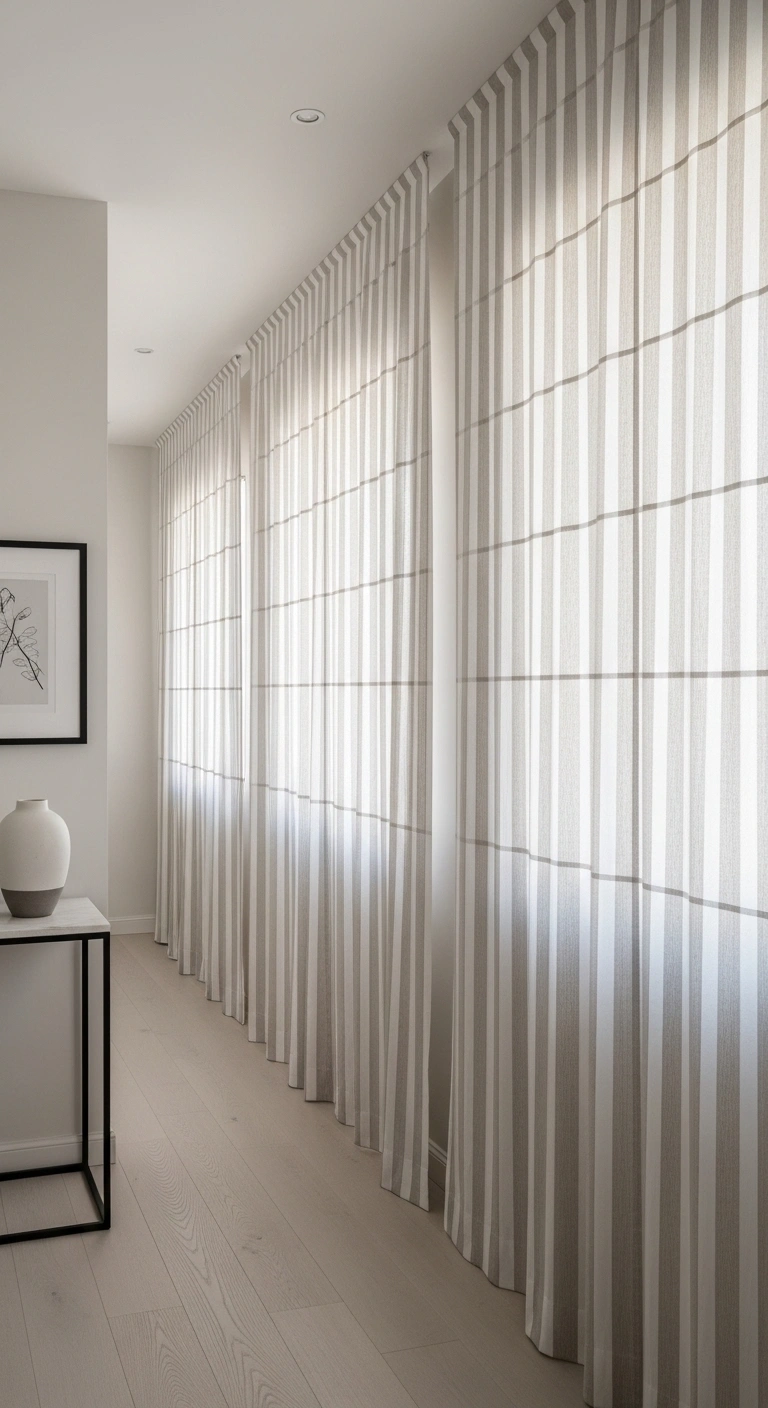 Vertical stripe Roman curtains help make windows appear taller. Even subtle stripes in similar tones can stretch the visual height of a room.