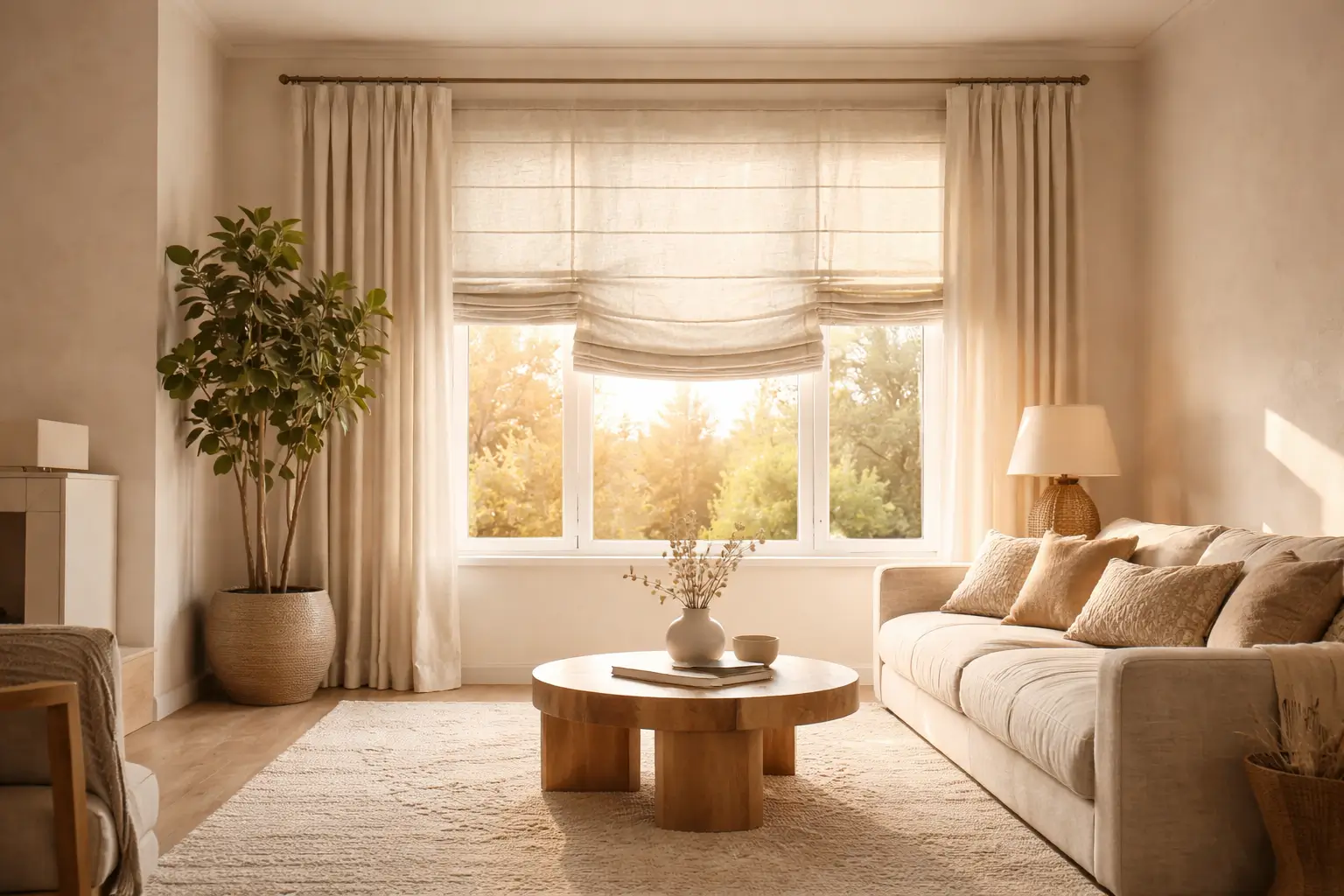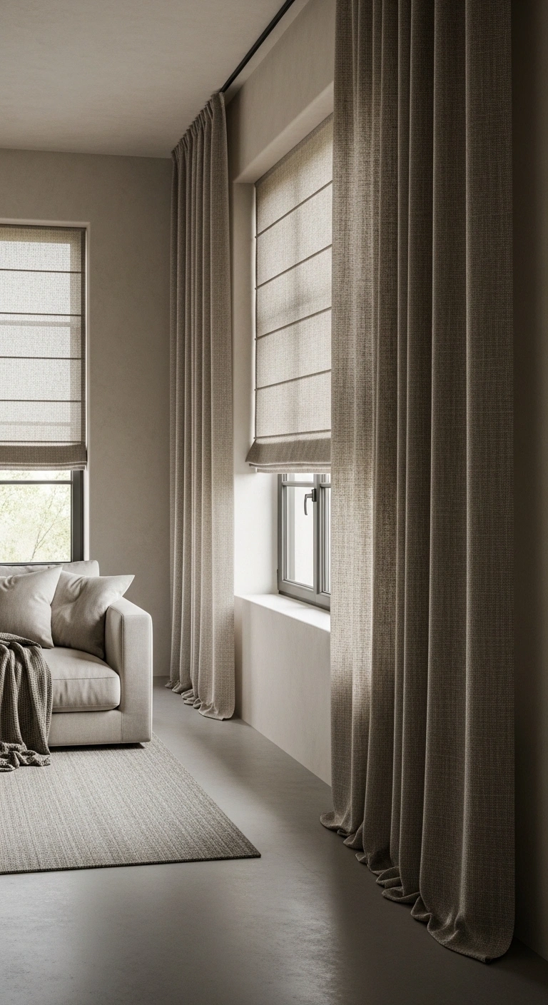 3. Neutral Layered Roman Curtains for Depth and Softness