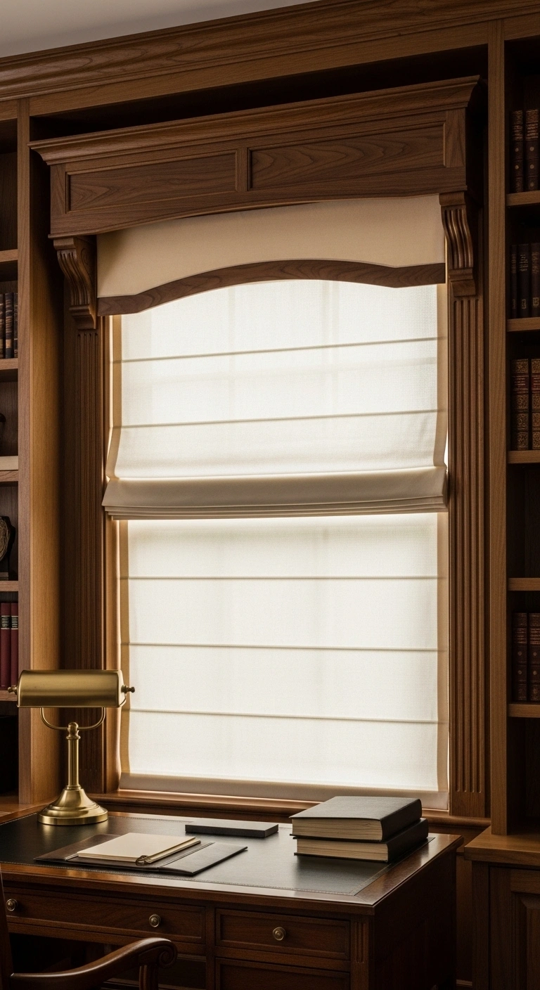 Adding a wooden valance above Roman curtains creates a layered and architectural look. The wood frame adds structure while the fabric brings softness.