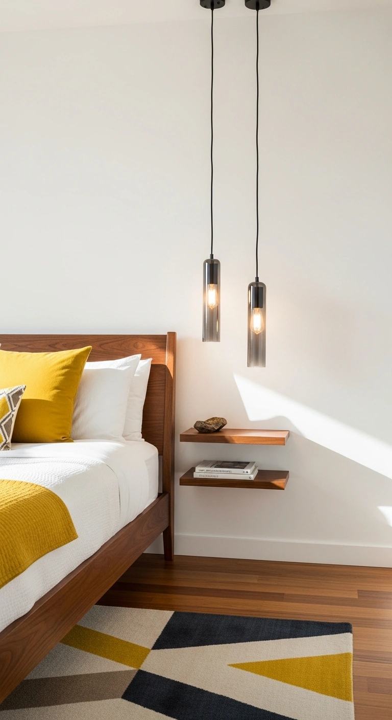 Pendant lights free up nightstand space instantly. Slim glass or metal pendants add elegance without bulk. The vertical drop draws the eye upward. Soft warm bulbs create a cozy glow. The bedside area feels open and modern. Less clutter equals more visual space.