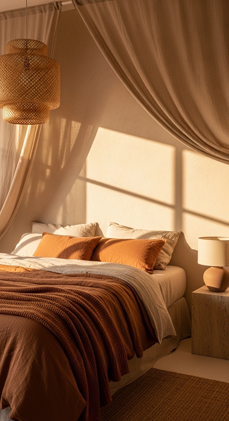 Mix linen bedding, woven rugs, and matte painted walls. Avoid high-contrast color breaks. Add subtle metallic accents for dimension. Keep furniture in similar tones. This approach works beautifully in compact spaces.