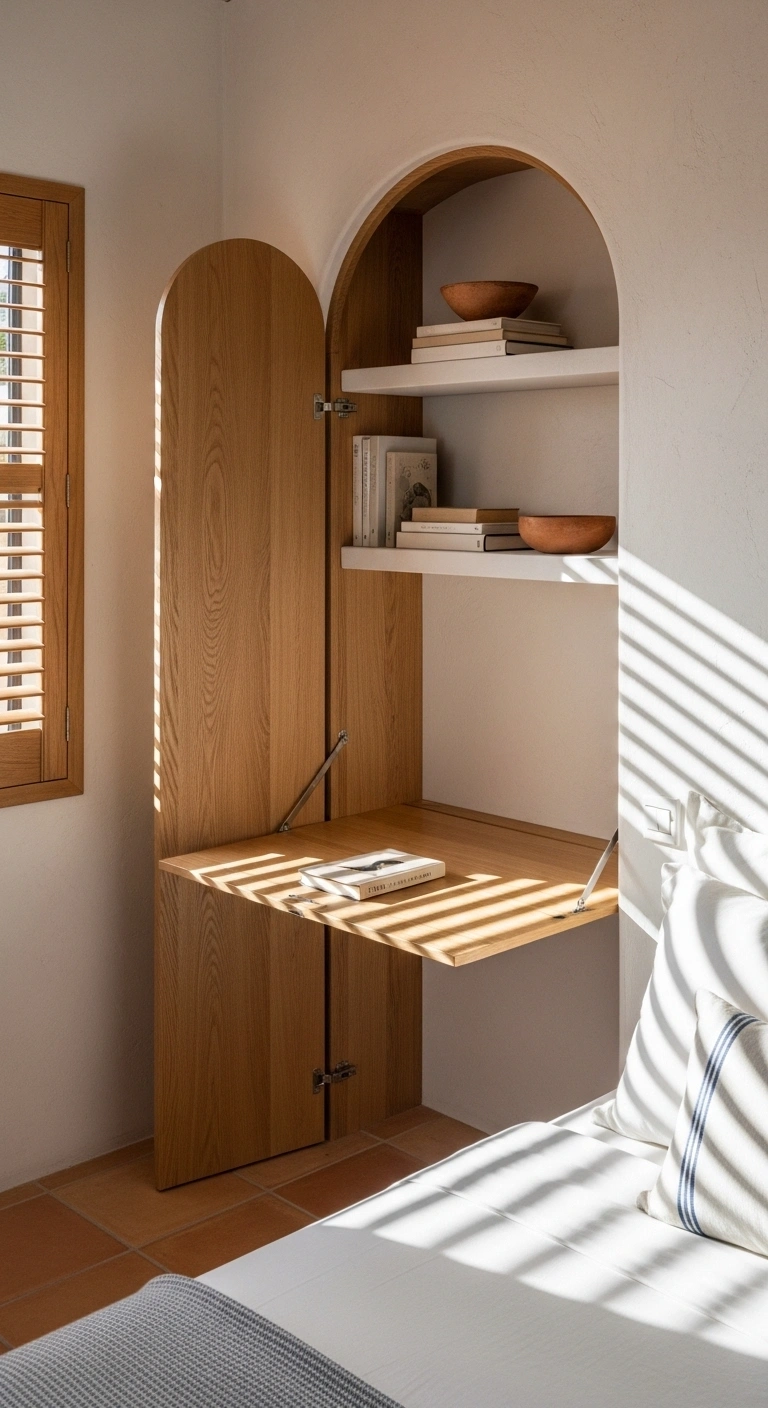 A fold-down desk keeps your small bedroom flexible. Closed, it looks like a slim cabinet. Open, it becomes a practical workspace. Soft wood finishes keep it warm and inviting. The room shifts easily from sleep to productivity. It saves precious floor space.