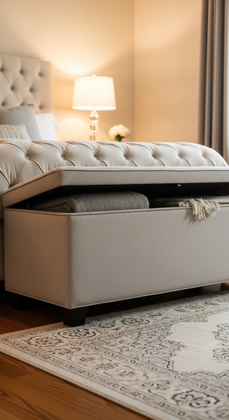A storage ottoman at the foot of the bed adds comfort and function. Upholstered fabric in soft beige or gray keeps it cozy. The hidden compartment stores extra bedding. It adds balance to the layout. The room feels complete and organized.