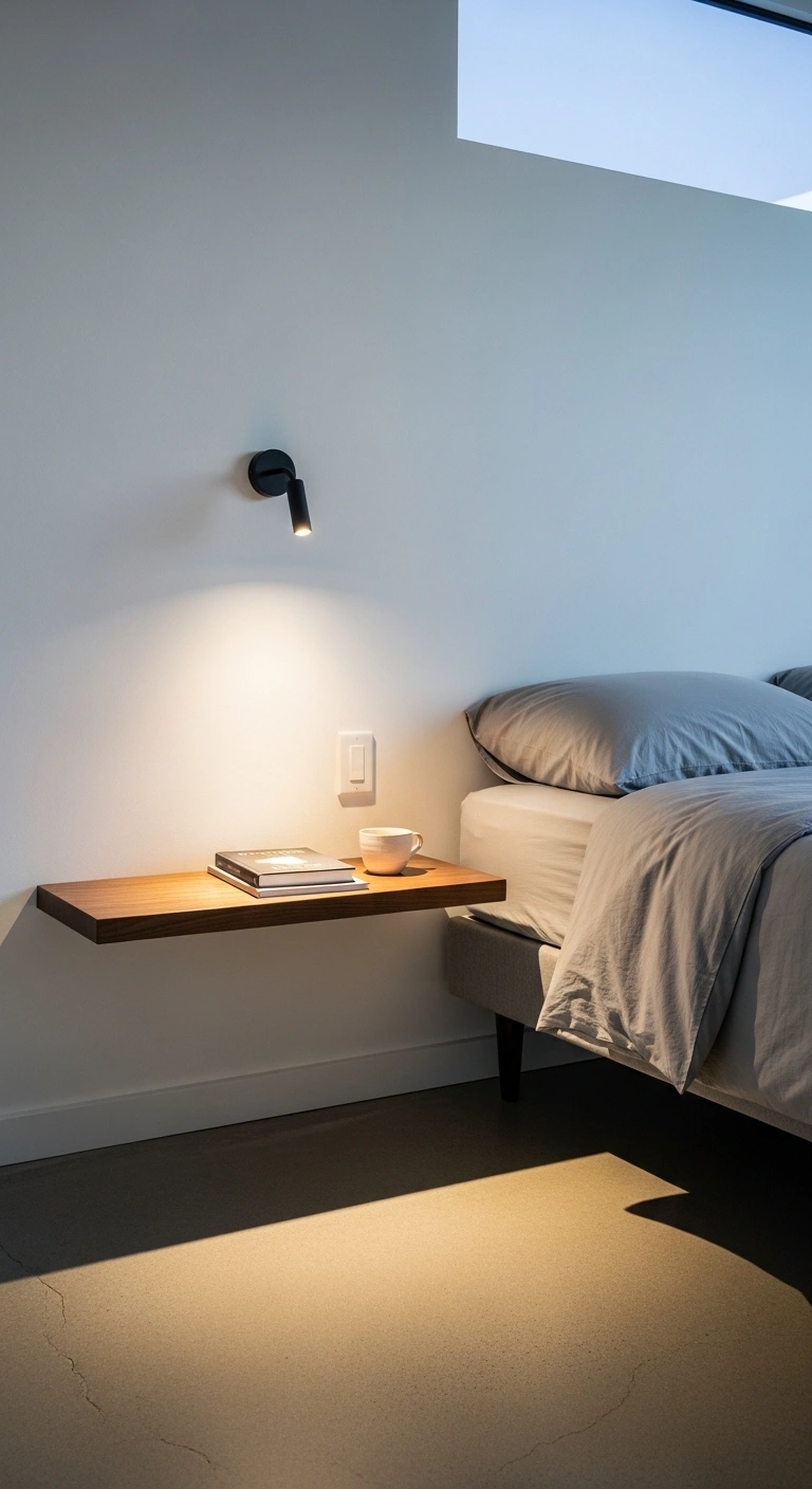 A wall-mounted night shelf saves floor space instantly. A slim wooden ledge holds essentials only. The area looks clean and modern. Light flows underneath freely. The room feels open and airy. It fits perfectly in tight layouts.