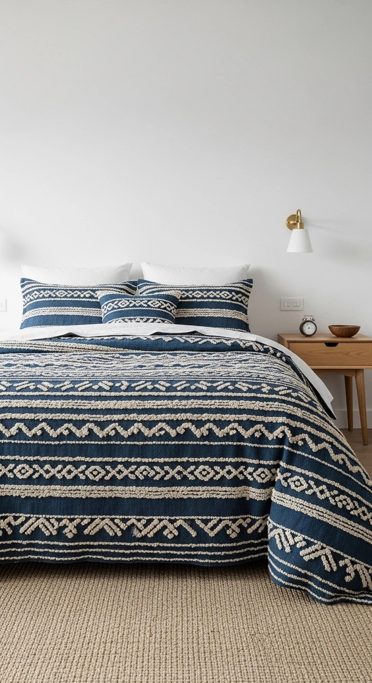 One bold textile adds character without clutter. A patterned duvet or textured rug draws focus. Keep other elements simple and neutral. The eye lands on one feature. The room feels styled but calm. Balance is key.