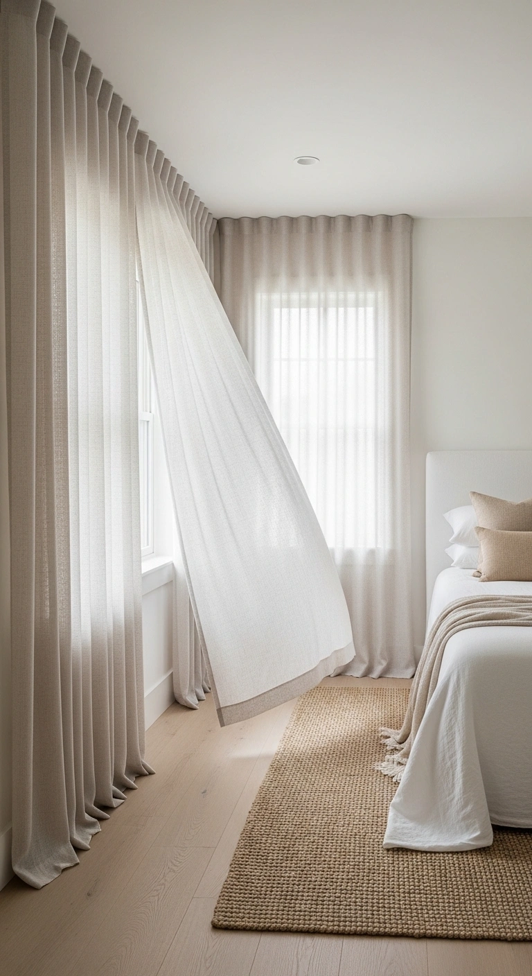Mount curtain rods close to the ceiling. Let fabric slightly pool on the floor. Choose lightweight materials. Keep wall colors simple. This trick adds elegance instantly.