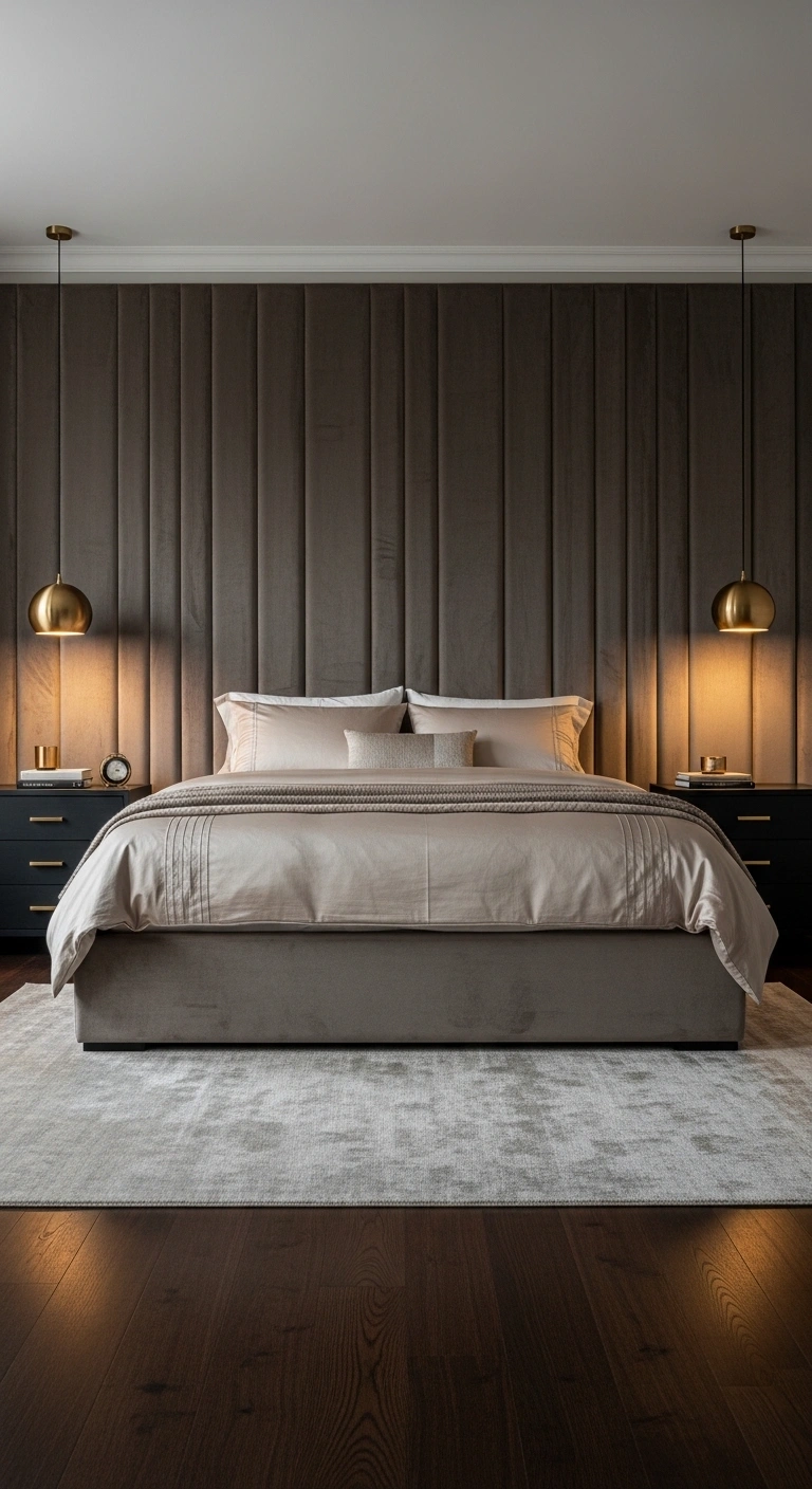 Vertical wood slats add height instantly. Warm oak or walnut tones bring natural texture. The lines guide the eye upward. The room feels taller and more dynamic. Paired with neutral bedding, the effect feels modern. It becomes a strong focal point.