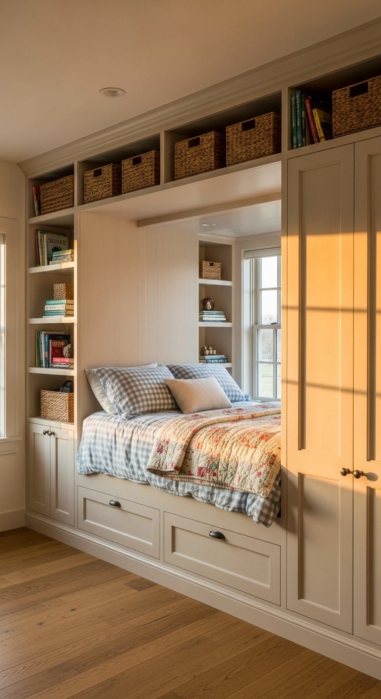 A built-in window bench creates charm and storage. Cushions in soft neutral fabrics invite relaxation. Hidden drawers underneath store essentials. Natural light highlights the nook beautifully. The room feels intentional and cozy.