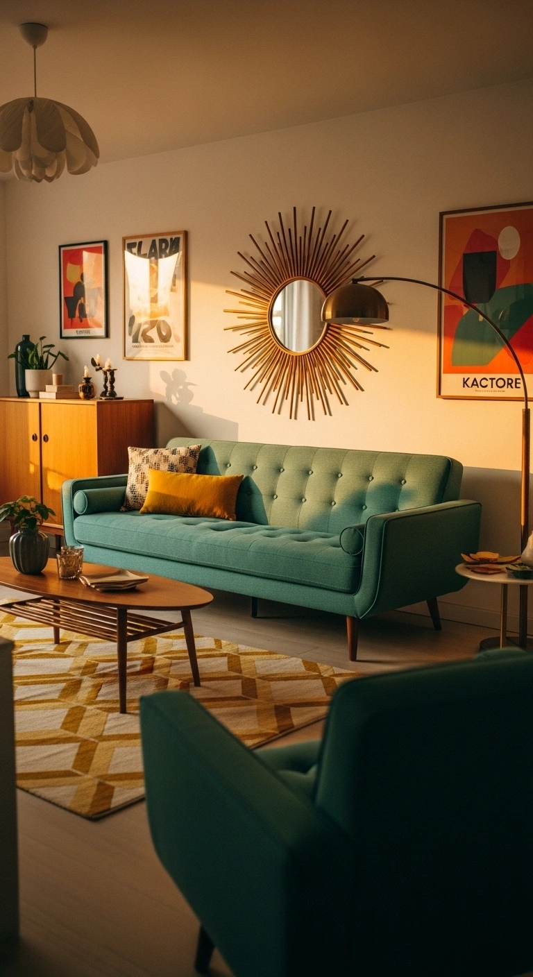 A teal green sofa pairs perfectly with mid-century modern furniture. The rich blue-green tone feels stylish and timeless. Combine it with tapered wooden legs and vintage-inspired decor. Add a geometric rug to reinforce the retro feel. Warm walnut wood tones complement teal beautifully. A statement floor lamp adds character. The room feels curated and full of personality.