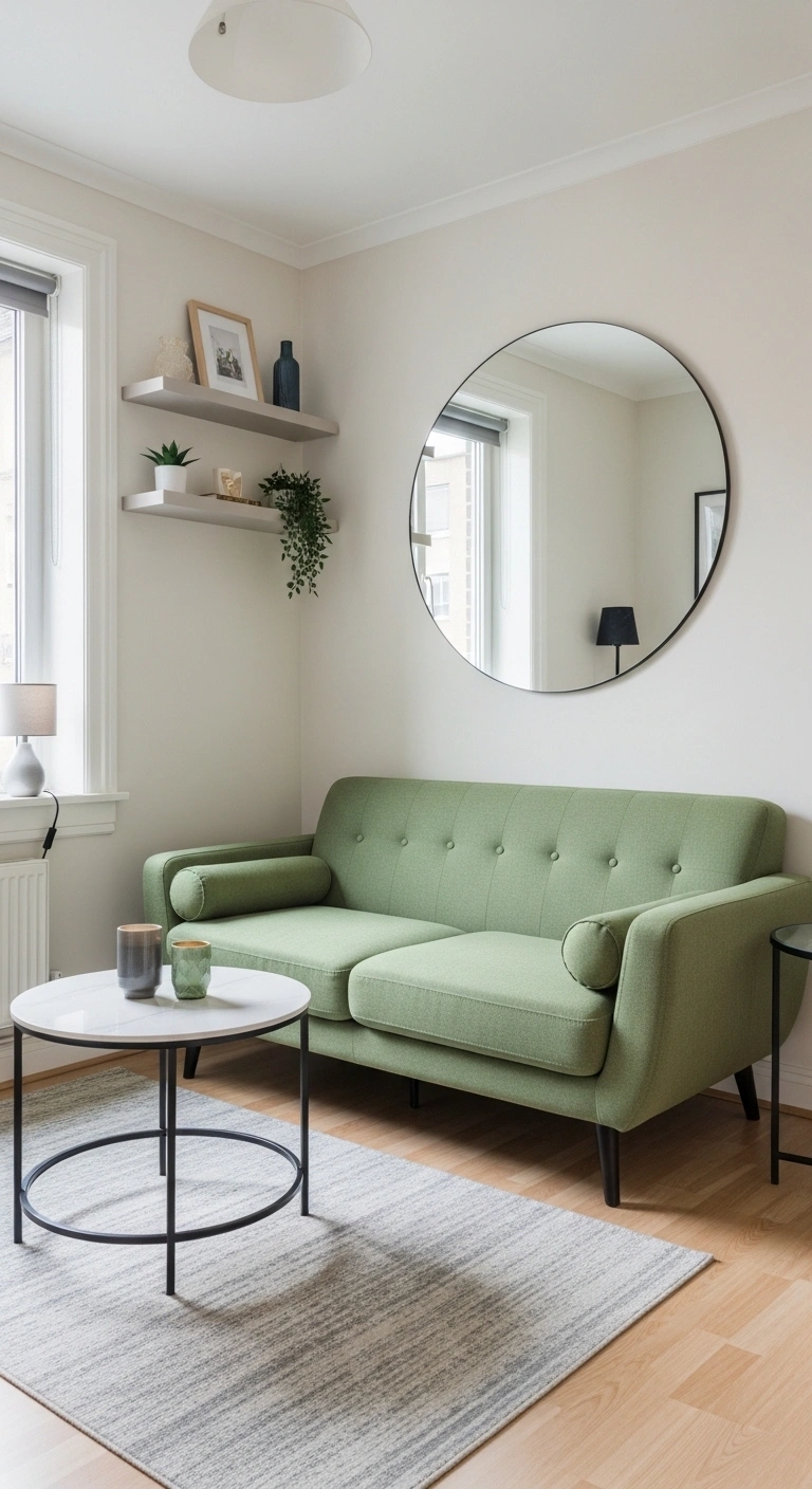A green couch can transform a small apartment living room without overwhelming it. Choose a compact two-seater in a soft green shade. Pair it with light walls and mirrors to reflect light. A small round coffee table saves space and improves flow. Add vertical shelving to maximize storage. Keep the color palette simple and cohesive. The space feels stylish yet functional.