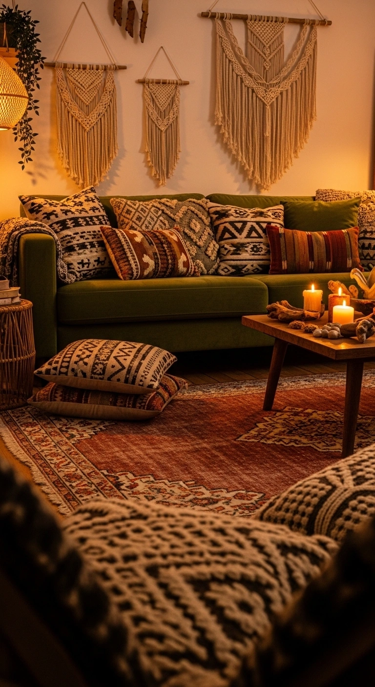 A green couch becomes even more inviting when layered with boho-inspired textures. Choose a rich green fabric and add patterned throw pillows. Layer a vintage-style rug underneath for warmth. Incorporate macramé wall hangings and woven decor. Add plants in ceramic pots for a natural touch. Soft ambient lighting creates a cozy evening mood. The space feels artistic and relaxed.