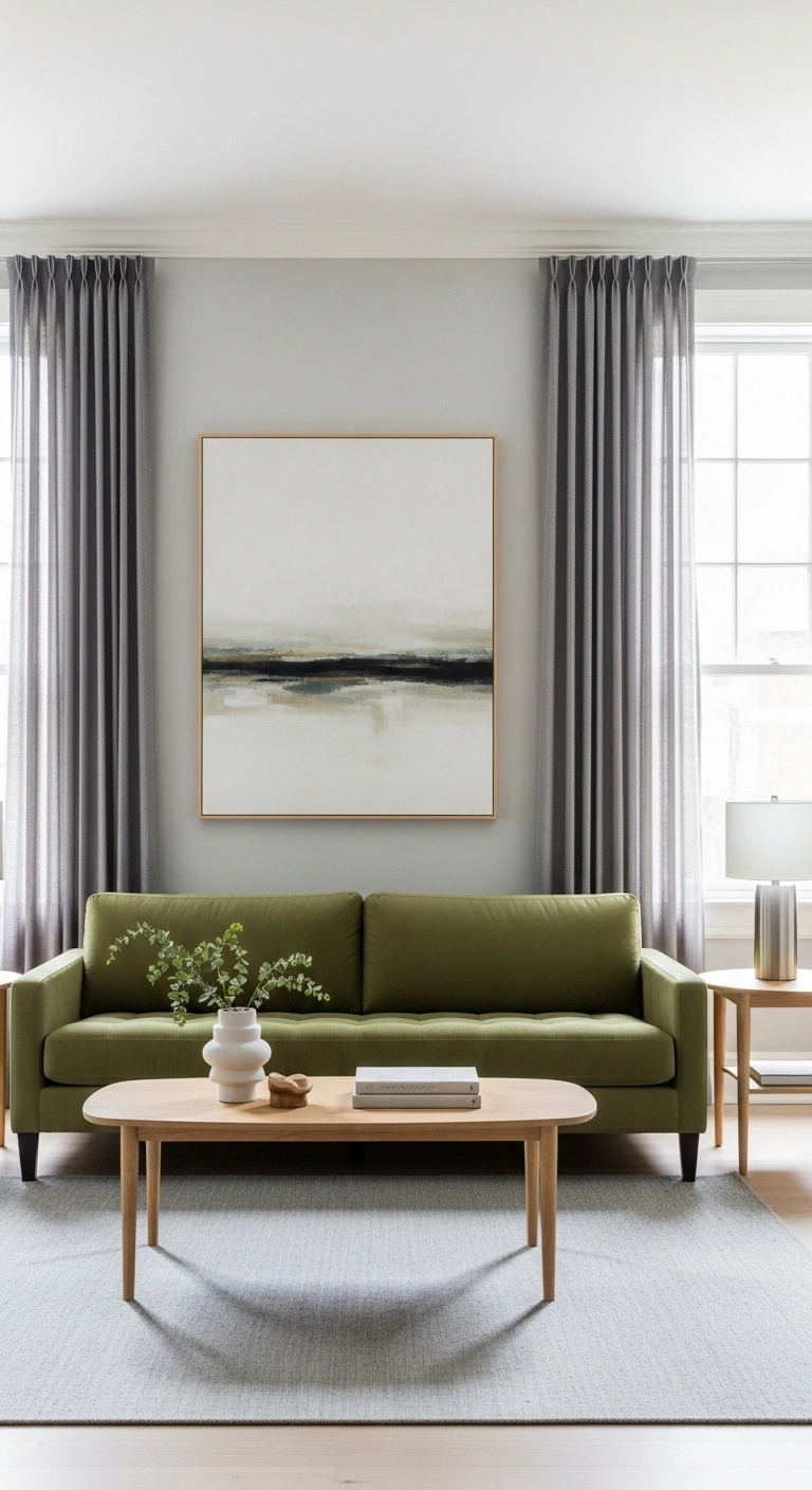 A moss green couch creates a calm and grounded living room when paired with soft gray layers. The muted green tone feels natural and slightly earthy without looking dark. Light gray walls and a pale gray rug soften the overall look. Add brushed nickel lamps and simple ceramic decor for a clean finish. A light wood coffee table keeps the space from feeling cool. Sheer curtains allow daylight to gently brighten the green fabric. The mood feels peaceful and balanced.