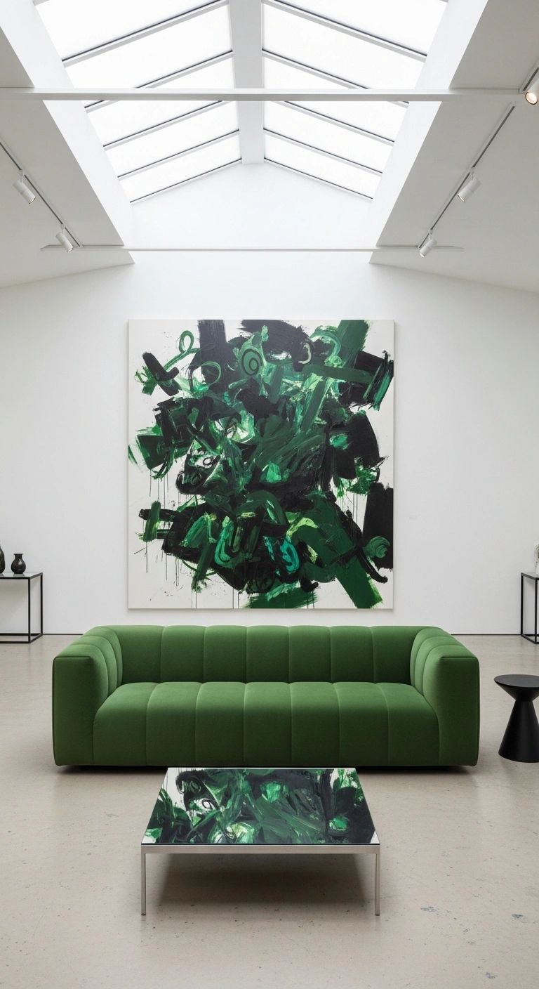 A bottle green sofa becomes the perfect base for bold statement artwork. The deep green shade feels rich and dramatic against a white or cream wall. Hang a large abstract painting above the couch to create a strong focal point. Add a simple glass coffee table so the art remains the star. Use warm wood accents to balance the depth of the sofa. Soft ambient lighting highlights both the artwork and the green fabric. The space feels curated and expressive.