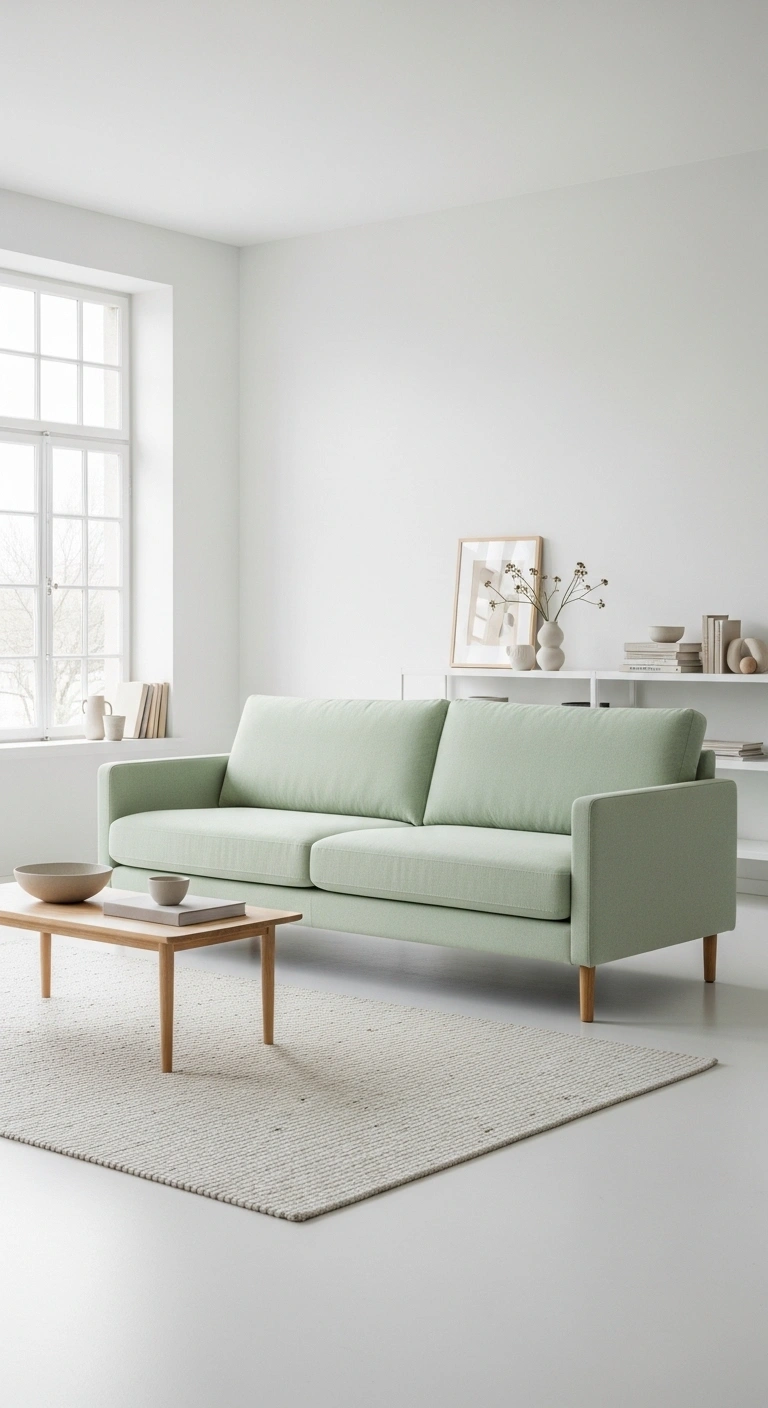 A pale green couch fits beautifully into a Scandinavian-inspired living room. The soft green tone feels light, fresh, and understated. Pair it with white walls, light oak floors, and minimal decor. Add a simple cream rug to define the seating area. Choose slim wooden furniture with clean lines. Keep the lighting bright and natural with sheer curtains. The overall vibe feels open, airy, and organized.