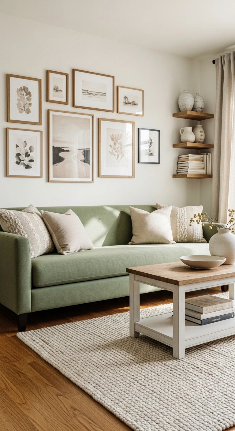 A green couch pairs beautifully with a layered neutral gallery wall. The green acts as a grounding base beneath framed prints. Use black, wood, and white frames for subtle variety. Choose artwork in beige, brown, and muted tones. A natural fiber rug adds warmth underfoot. Keep furniture shapes simple to let the wall shine. The space feels personal and thoughtfully styled.