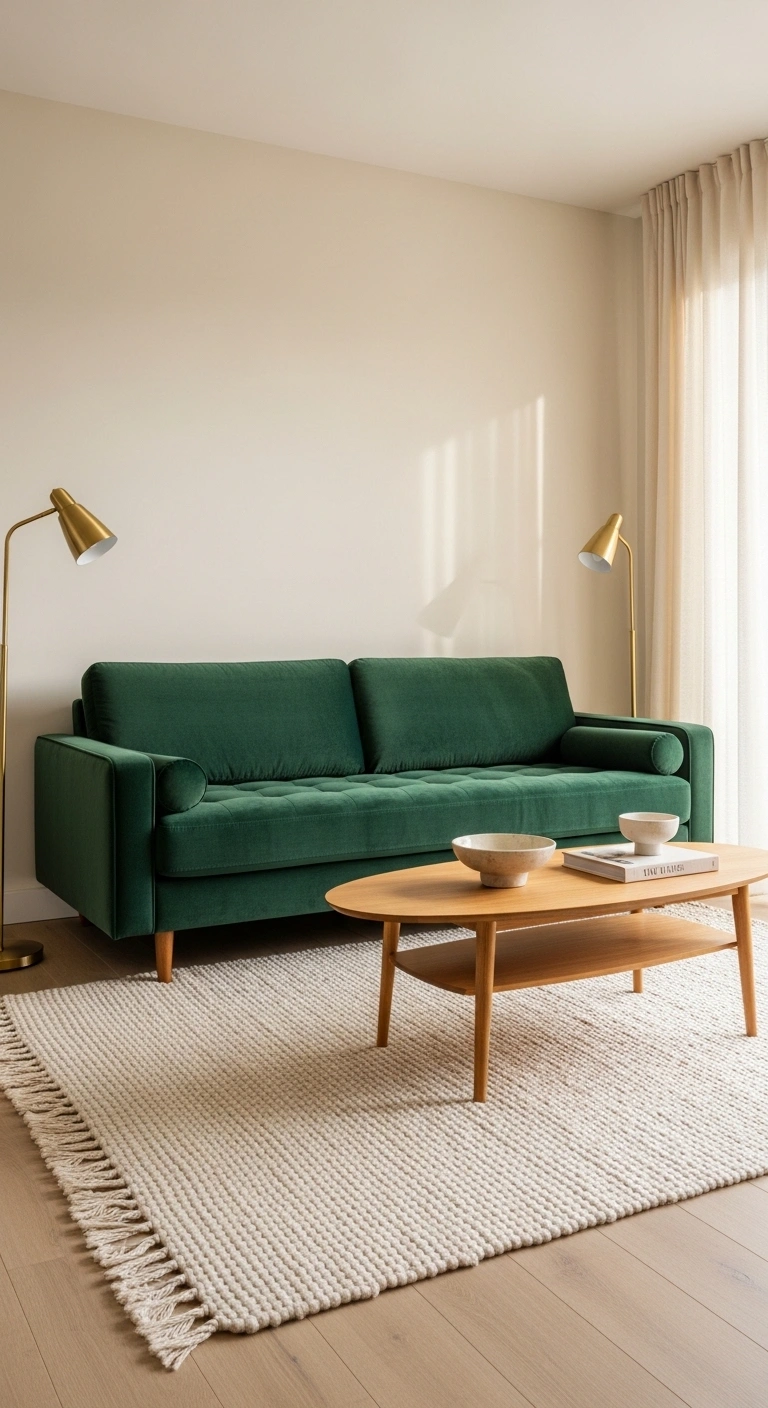 An emerald green couch creates a bold and luxurious focal point in a neutral living room. The deep jewel tone instantly draws the eye and adds richness to the space. Pair it with warm beige walls, soft cream curtains, and a light oak coffee table for balance. Add brass accents through lamps or trays to enhance the warmth. A textured off-white rug keeps the look grounded and soft underfoot. Natural light makes the green glow beautifully during the day, while warm lighting deepens its tone at night. This look feels polished yet inviting.